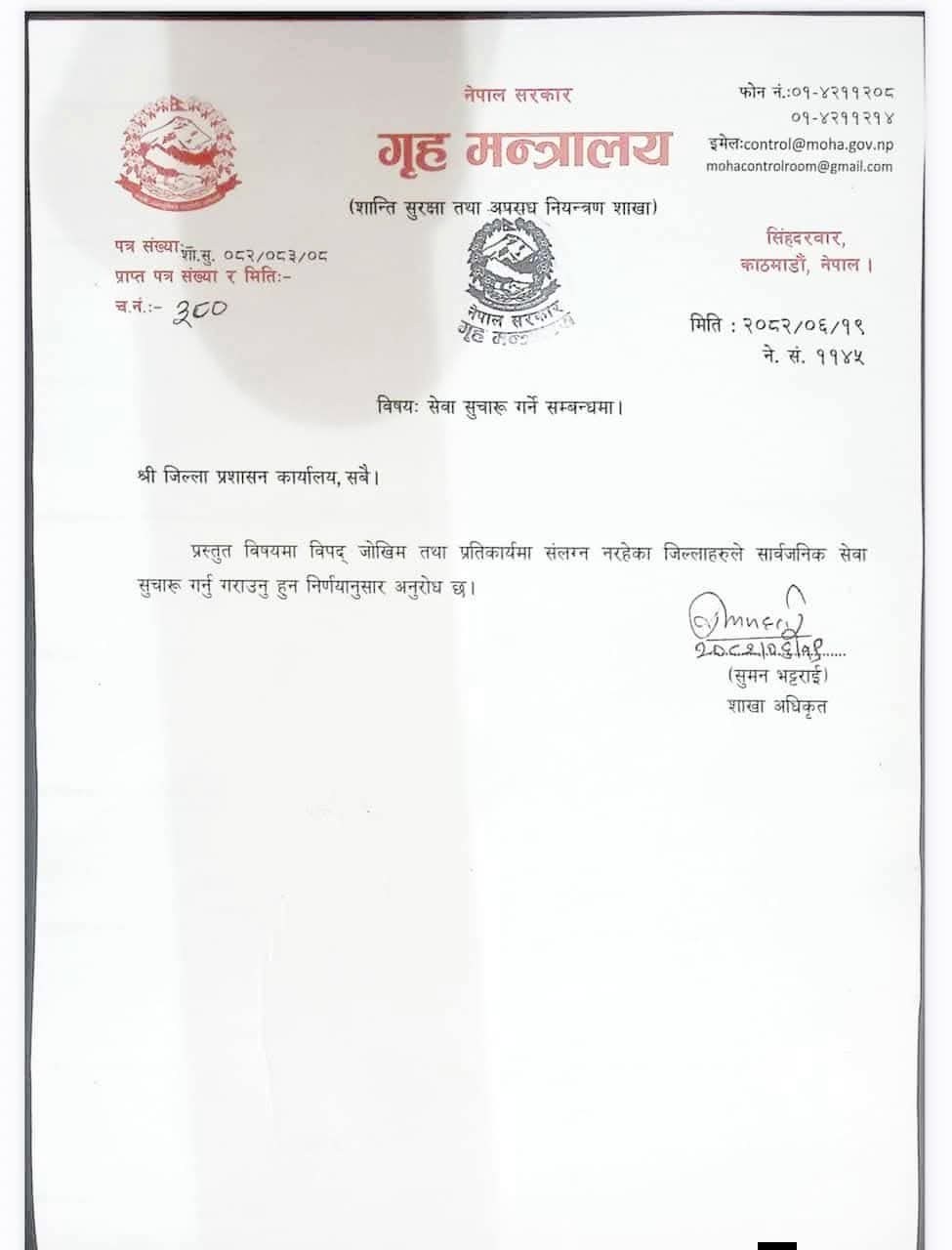 काठमाडाैं। गृह मन्त्रालयले विपत् जोखिम नहरेका जिल्लामा सोमबार सरकारी कार्यालयहरू सञ्चालन गर्न निर्देशन दिएको छ।
