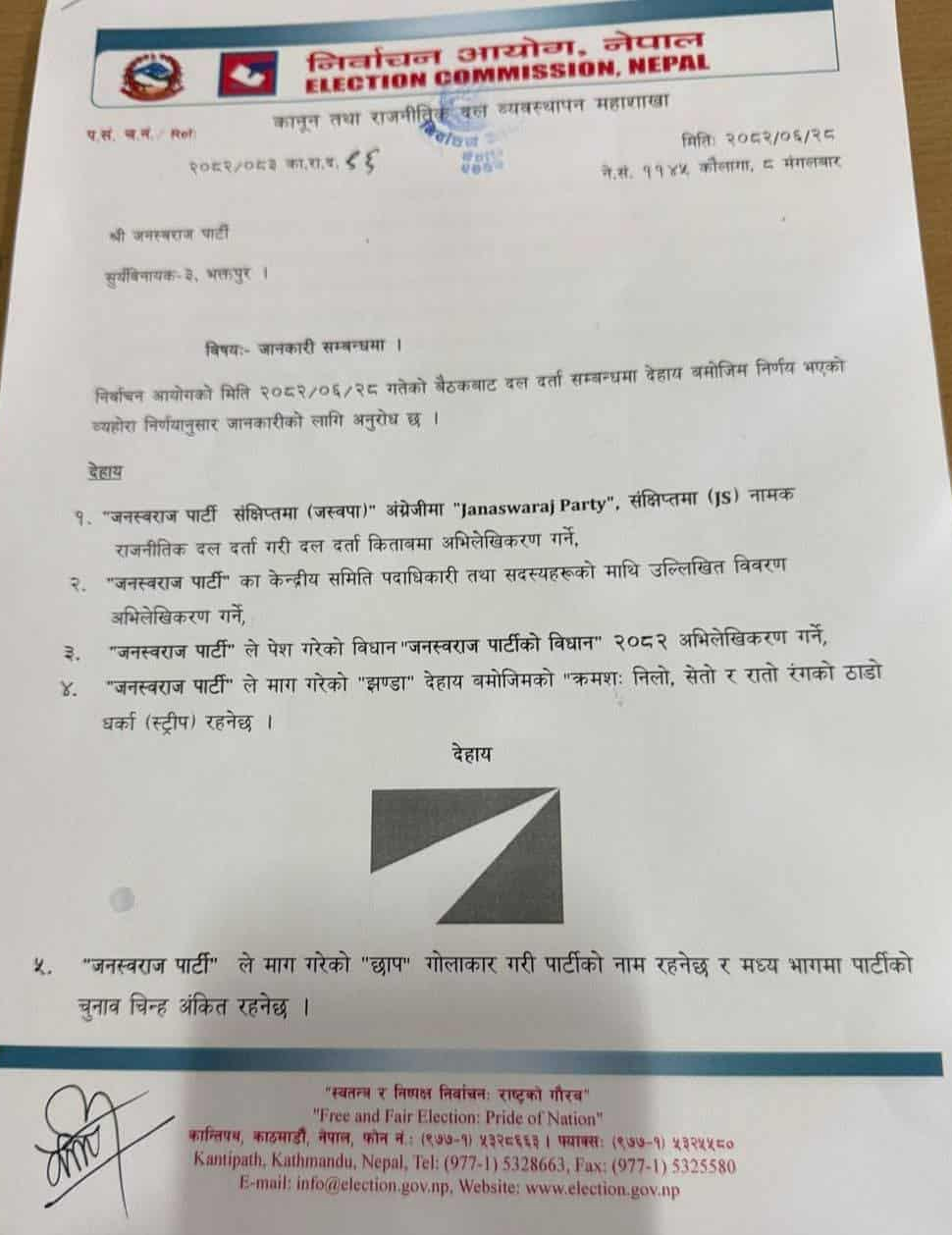 मंगलबार निर्वाचन आयोगले जनस्वराज पार्टी (जस्वपा)लाई मान्यता दिएको हो।