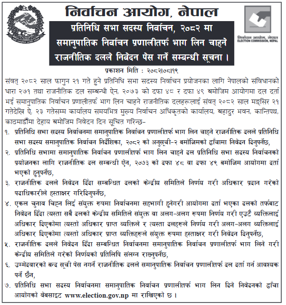 काठमाडौं । निर्वाचन आयोगले आसन्न प्रतिनिधि सभा सदस्य निर्वाचनका लागि समानुपातिक निर्वाचन प्रणालीतर्फको निर्वाचनमा भाग लिन चाहने राजनीतिक दलहरूलाई निवेदन दिन आह्वान गरेको छ।