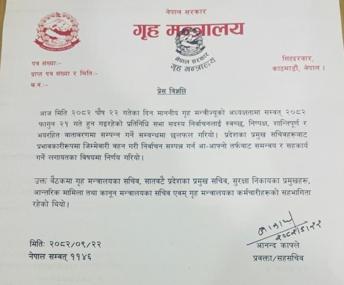 काठमाडौं । गृह मन्त्रालयले तराई तथा मधेशका केही जिल्लाहरूमा धार्मिक तथा सामाजिक सद्भाव खलबलाउने गरी भएका केही घटनाका सम्बन्धमा जिल्ला तहमा धार्मिक सहिष्णुता कायम राख्न भएका पहलकदमीसहितको प्रगतिलाई समेटेर पठाउन ७७ वटै जिल्ला प्रशासन कार्यालयहरूलाई १०–बुँदे निर्देशनात्मक सर्कुलर जारी गरिएको छ।