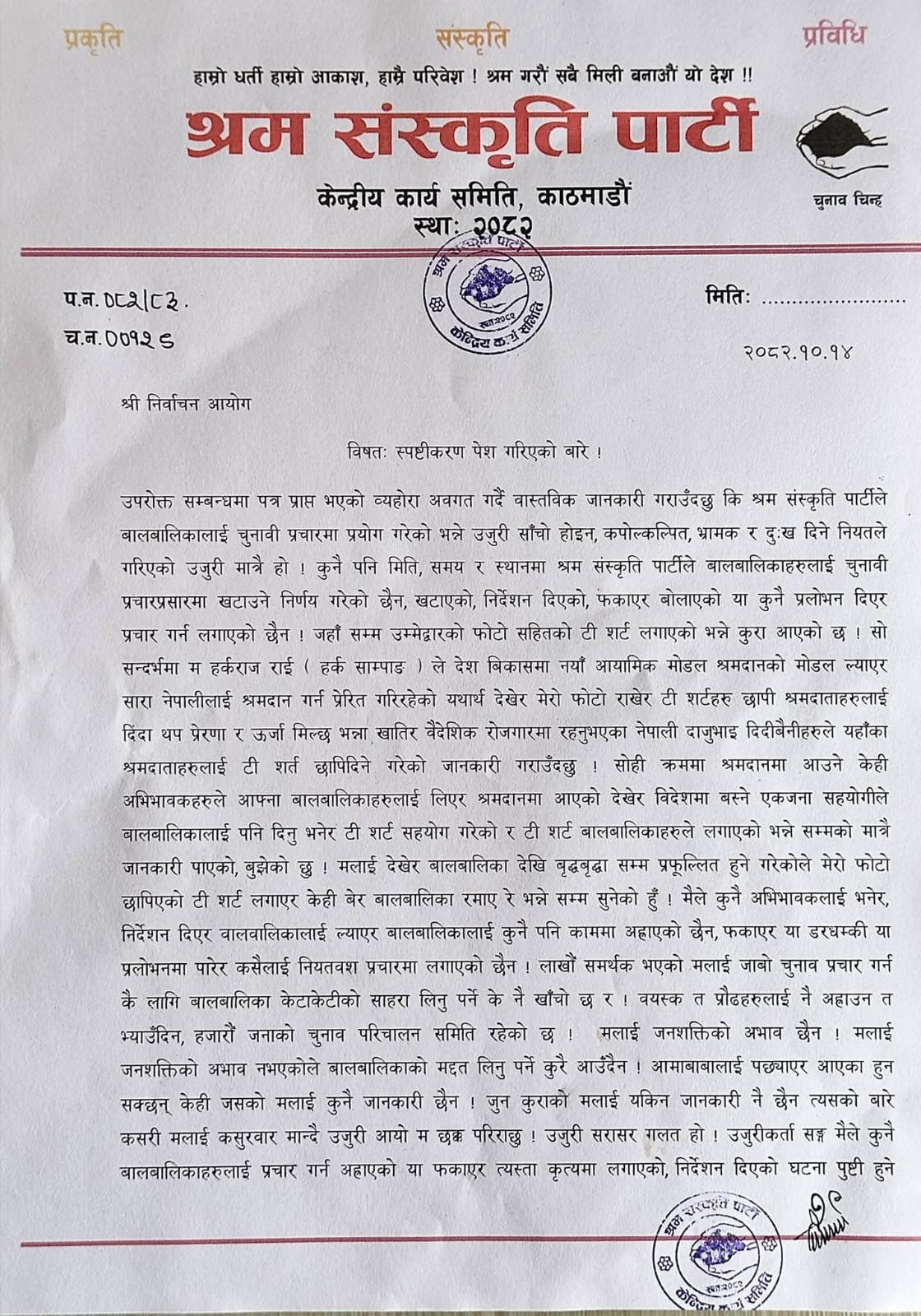 साथै, उनले कुनै पनि अभिभावकलाई बालबालिकालाई प्रचारमा प्रयोग गर्न आग्रह, निर्देशन वा प्रलोभन नदिएको स्पष्ट पारेका छन्। सामाजिक सञ्जालमा फैलाइएका भिडियो तथा सामग्री सबै यथार्थ नहुन सक्ने र प्रविधिको दुरुपयोगबाट भ्रम सिर्जना गरिएको दाबी पनि स्पष्टीकरणमा उल्लेख गरिएको छ।