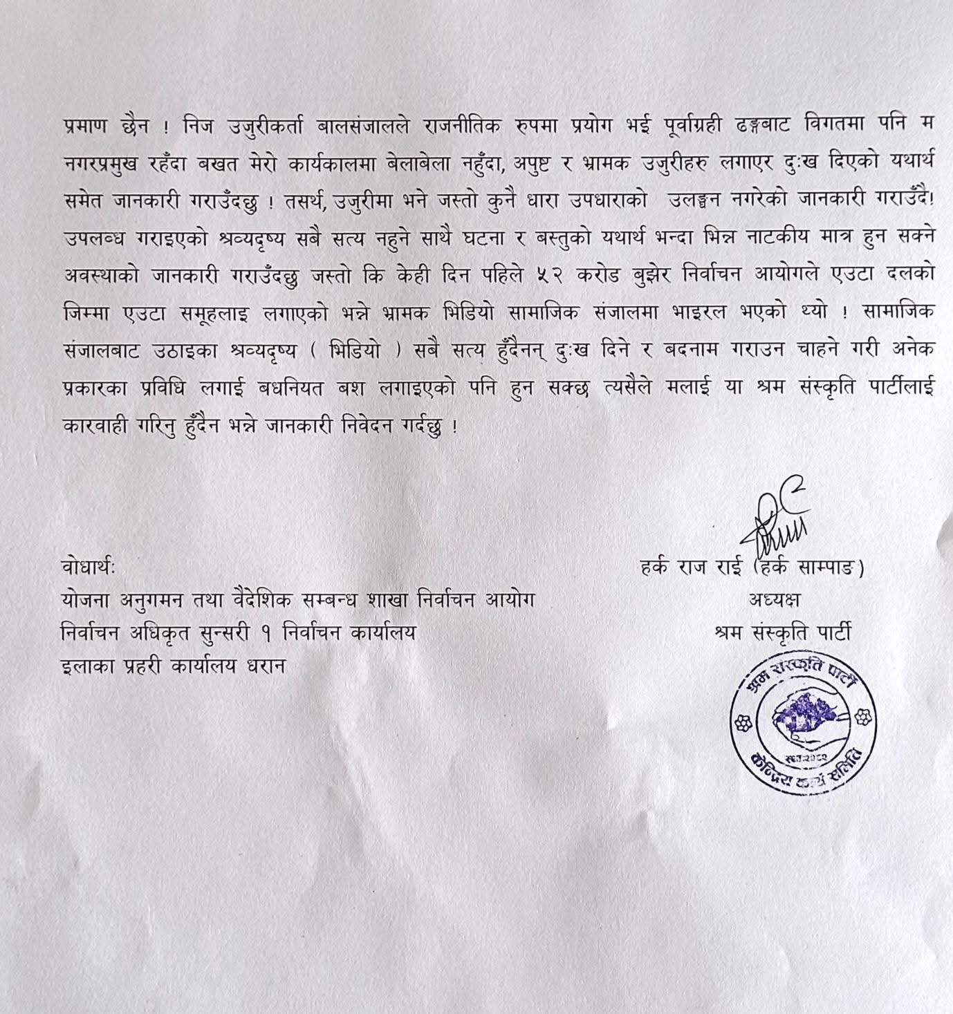 धरान : धरान उपमहानगरपालिकाका पूर्व नगर प्रमुख तथा श्रम संस्कृति पार्टीका अध्यक्ष हर्कराज राई (हर्क साम्पाङ) ले चुनावी प्रचार–प्रसारमा बालबालिका प्रयोग गरेको आरोपबारे निर्वाचन आयोगमा लिखित स्पष्टीकरण पेश गरेका छन्। केही दिनअघि बालबालिकालाई चुनावी प्रचारमा प्रयोग गरिएको भन्ने उजुरी परेपछि निर्वाचन आयोगले साम्पाङसँग स्पष्टीकरण माग गरेको थियो।
