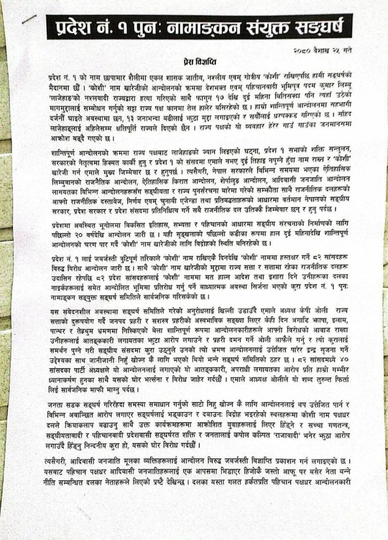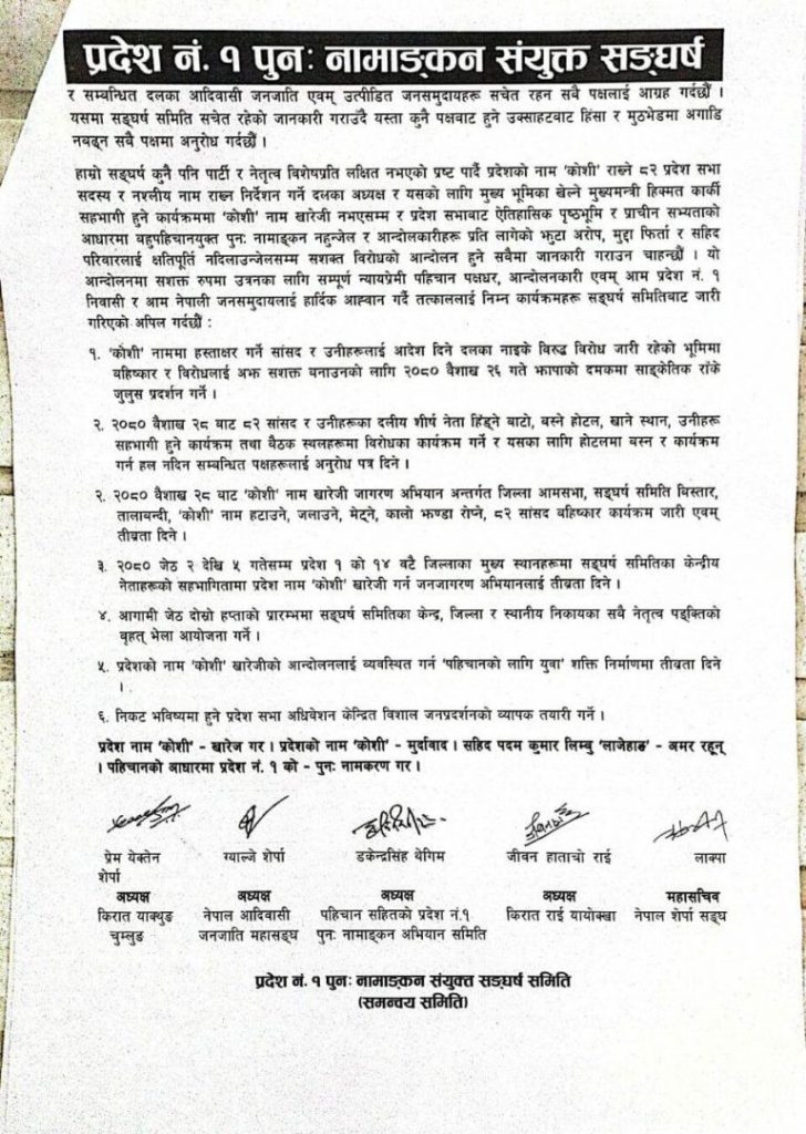 विराटनगर । कोशी नाम खारेज गर्दै प्रदेशको पुनः नामाकरणको मागसहित आन्दोलनको कार्यक्रमहरू घोषणा गरिएको छ । ‘प्रदेश नं १ पुनः नामाङ्कन संयुक्त संघर्ष समिति’ ले आन्दोलनको नयाँ कार्यक्रम घोषणा गरेको हो ।