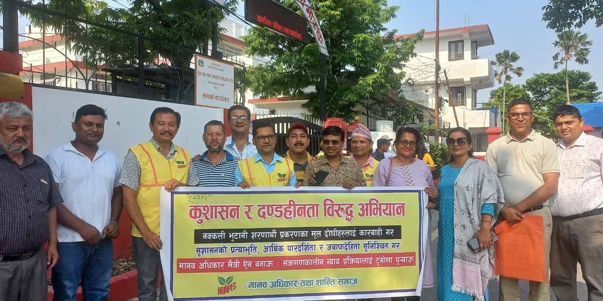 सो ज्ञापन पत्रमा भनिएको छ ‘नक्कली भुटानी शरणार्थी सन्दर्भमा सरकारी कार्यदल गठनको नियतदेखि चलखेलसम्मका सम्पूर्ण फेरिहस्तहरुको सूक्ष्म अध्ययन अनुसन्धान गरी दोषीहरू प्रमुख दलका शीर्ष नेताहरूसहित जो कोही हुन् कानुनसम्मत कारबाही सुनिश्चित गर्न, सुशासनको प्रत्याभूति , आर्थिक पारदर्शिता र जबाफदेहिता सुनिश्चित गर्न र मानवअधिकार मैत्री ऐन बनाई संक्रमणकालिन न्याय पक्रियालाई टुङ्गोमा पुर्याउन मानवअधिकार तथा शान्ति समाजको तर्फबाट आग्रह गर्दछौँ ।’