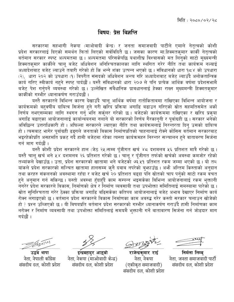 ‘संवैधानिक र कानूनी व्यवस्था विपरीत प्रदेशसभालाई छलेर अध्यादेशमार्फत आउने बजेट स्विकार्य नहुने सम्बन्धीत सबैमा जानकारी पनि गराउँछौं । यस्तै संविधानको धारा २०७ ले पनि प्रत्येक आर्थिक वर्षमा प्रदेशसभामै बजेट पेश गर्नुपर्ने व्यवस्था गरेको छ । उल्लेखित संवैधानिक प्रावधानलाई हेक्का राख्न मुख्यमन्त्री हिक्मतकुमार कार्कीको गम्भीर ध्यानाकर्षण गराउँदछौं,’ विज्ञप्तिमा उल्लेख छ ।