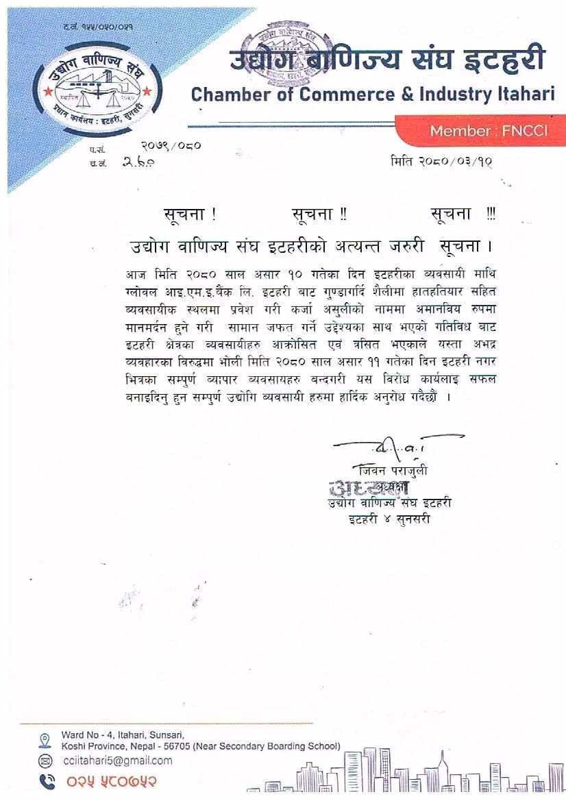 इटहरीका व्यवसायीमाथि ग्लोबल आइएमइ बैंक लिमिटेडबाट ‘गुण्डागर्दी शैलीमा हातहतियारसहित’ आएर धम्क्याएको भन्दै विरोधमा बजार बन्द गरिएको हो ।