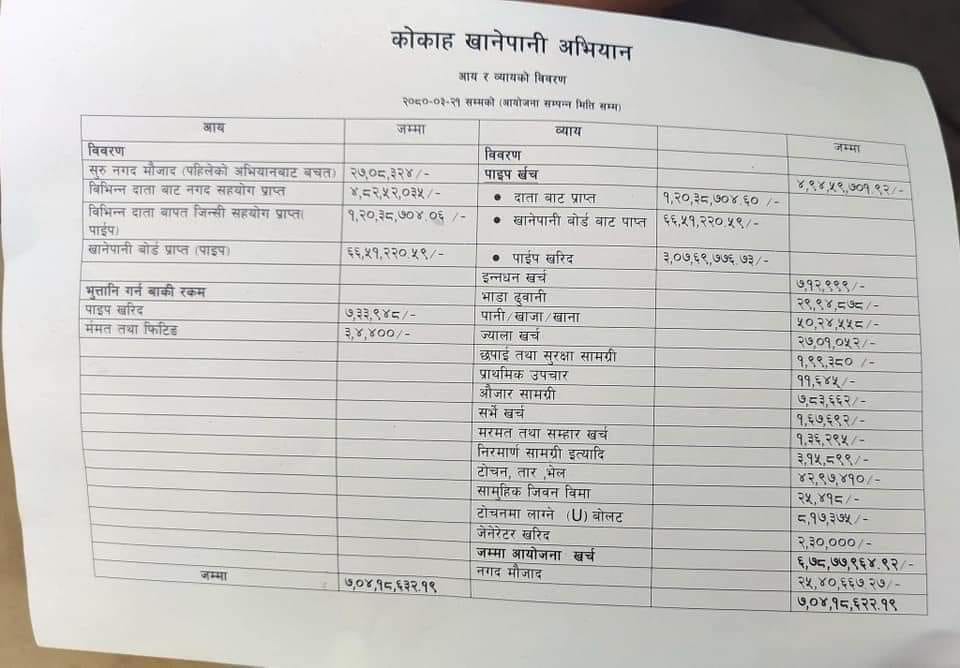 यसैगरी, खर्चतर्फ दाताबाट र खानेपानी बोर्डबाट प्राप्त भएको बाहेक अभियानमार्फत पाइप खरिदमा ४ करोड ९४ लाख ५९ हजार ७०१ रुपैयाँ भएको भएको छ भने इन्धन खर्च ७ लाख १२ हजार ९९९, भाडा ढुवानीमा २९ लाख ९४ हजार ८७८ रुपैयाँ, खाना तथा खाजा, पानीमा ५० लाख २४ हजार ५५८, ज्याला खर्च २७ लाख १ हजार ५२, टोचन तार र भल्वमा ४२ लाख ९७ हजार ४१० रुपैयासहित कुल खर्च ६ करोड ७८ लाख ७७ हजार ९६४ रुपैयाँ भएको जनाइएको छ ।