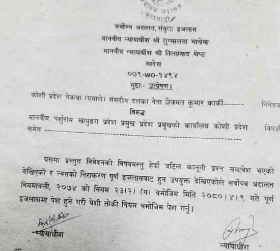 एमाले संसदीय दलका नेता हिक्मत कार्कीले पेस गरेको रिट निवेदनमाथि सुनुवाइ गर्दै इजलासले पूर्ण इजलासमा पठाउन आदेश दिएको सर्वोच्च अदालतका प्रवक्ता बिमल पौडेलले बताए ।