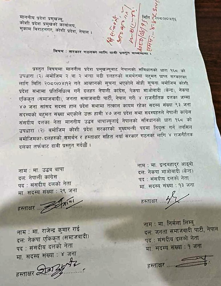 राजीनामापछि उनीसहित ४७ जनाको समर्थनमा थापाले मुख्यमन्त्रीमा दाबी पेस गरेका हुन् ।