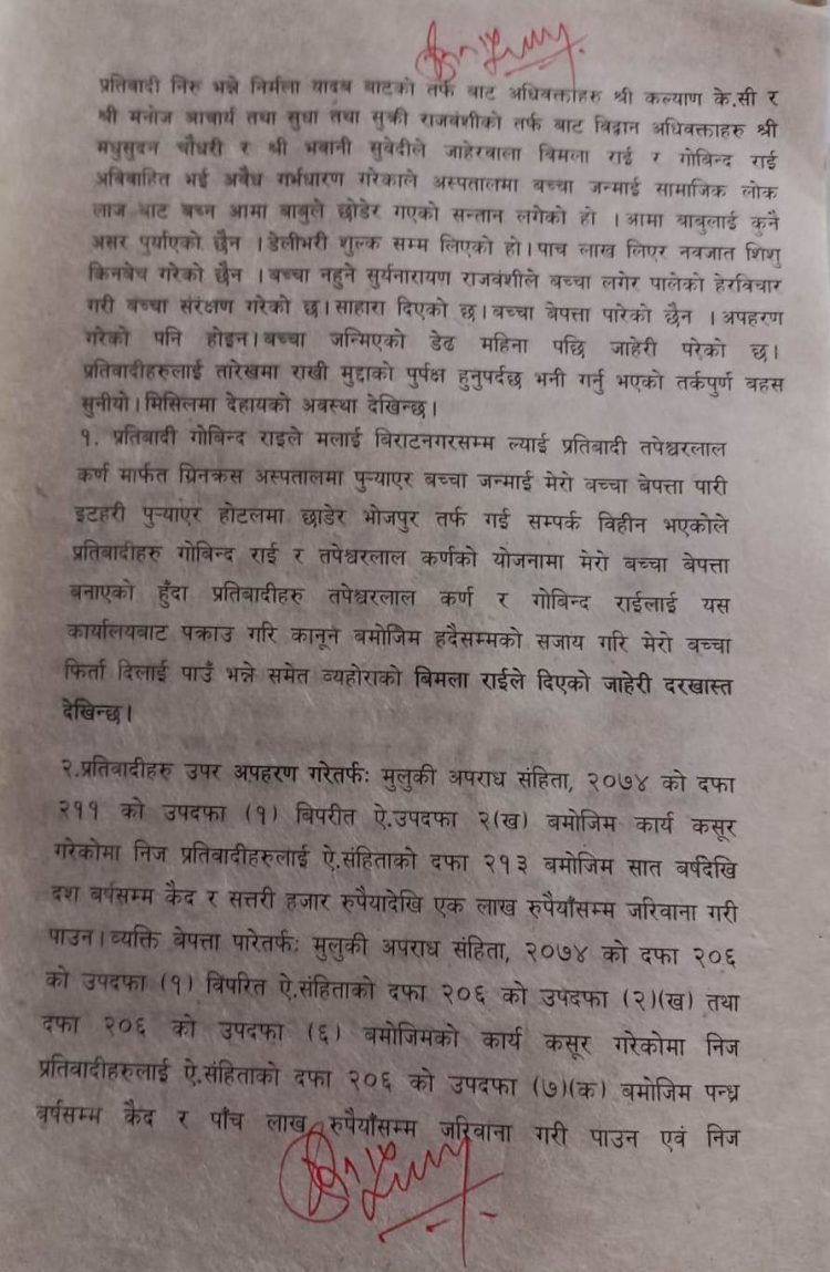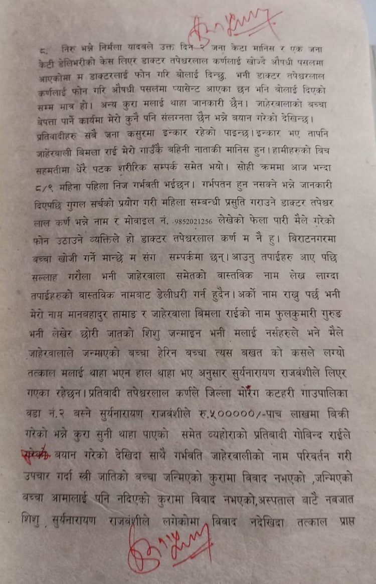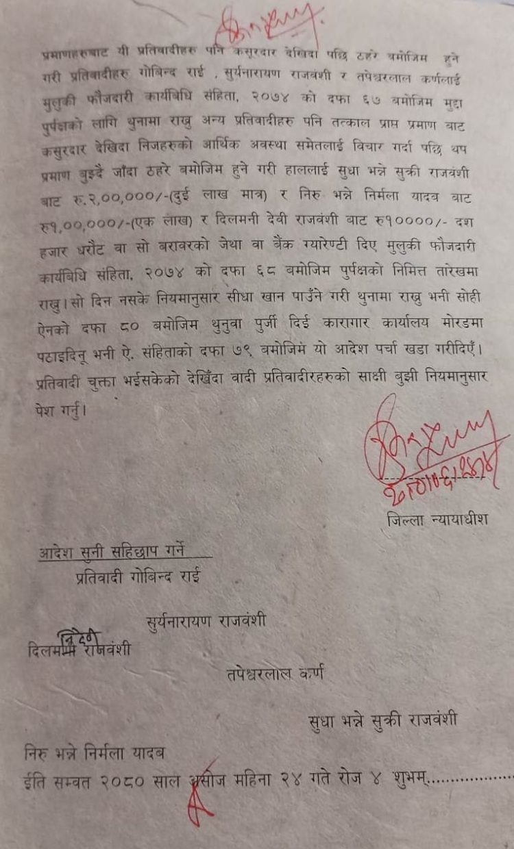 न्यायाधीश अम्बिकाप्रसाद दाहालको इजलासले अन्य ३ जनालाई धरौटीमा छाडेर मुद्दाको पुर्पक्ष गर्न आदेश दिएको छ । शिशु बिक्री घटनामा विराटनगर–२ तीनपैनी घर भएका वरिष्ठ प्रसूति तथा स्त्रीरोग विशेषज्ञ ६८ वर्षीय डा. तपेश्वरलाल कर्ण, शिशुका बाबु भोजपुरको हतुवागढी गाउँपालिका–४ का २७ वर्षीय गोविन्द राई र डा. तपेश्वरसँग शिशु खरिद गरेर लैजाने मोरङको कटहरी गाउँपालिका–२ आदर्श टोलका ३० वर्षीय सूर्यनारायण राजवंशीलाई थुनामा राख्न अदालतले आदेश दिएको हो ।