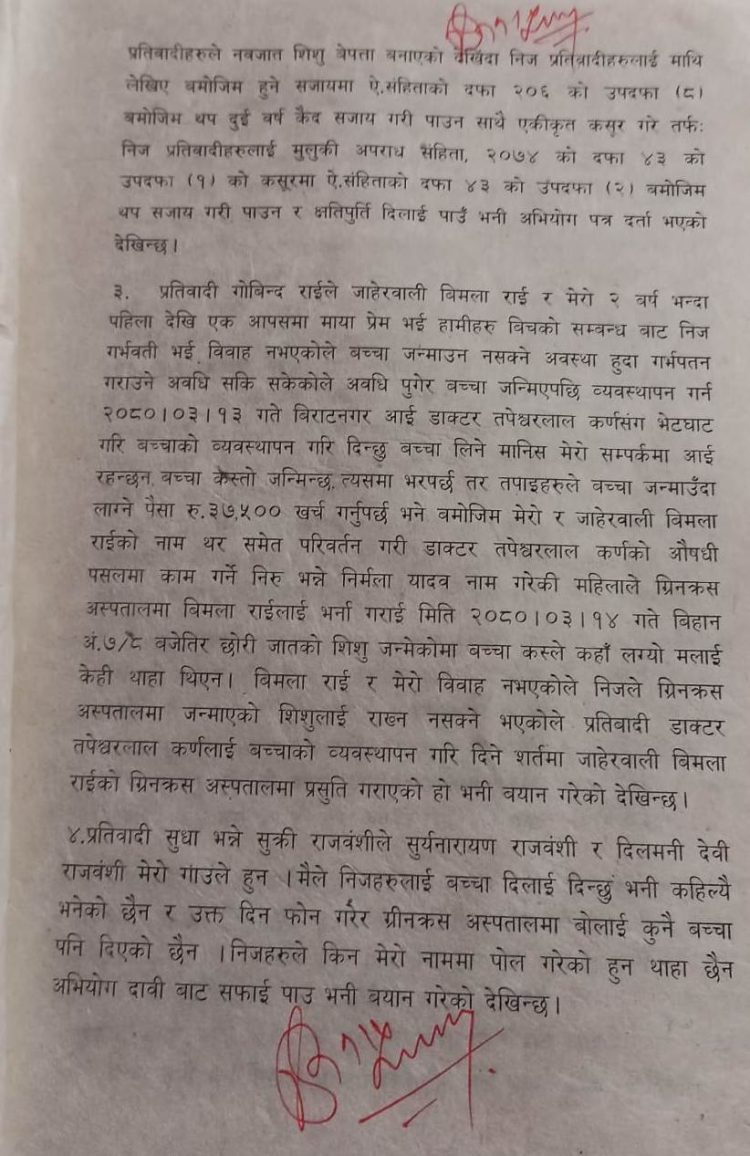 अदालतको आदेशबाट कारागार चलान भएका गोविन्द राईसँगको शारीरिक सम्पर्कबाट गर्भवती भएकी २६ वर्षीया अविवाहित युवतीले असार १४ गते शिशु (छोरी) जन्माएकी थिइन् । बिहे गर्ने प्रलोभन देखाएर गर्भवती बनाएपछि गोविन्दले युवतीलाई बच्चा जन्माउने भनेर विराटनगर ल्याएको अनुसन्धानबाट खुलेको छ । ३५ हजार रूपैयाँमा कुरा मिलेपछि डा. तपेश्वरले गर्भवती युवतीलाई ग्रीनक्रस अस्पताल लगेर प्रसूति गराएका थिए । ‘नर्मल डेलिभरी’मार्फत छोरी जन्माए पनि युवतीले लैजान पाइनन् । अस्पतालले बिदा दिएपछि युवतीलाई प्रेमी गोविन्दले सुनसरीको इटहरी लिएर गएका थिए ।