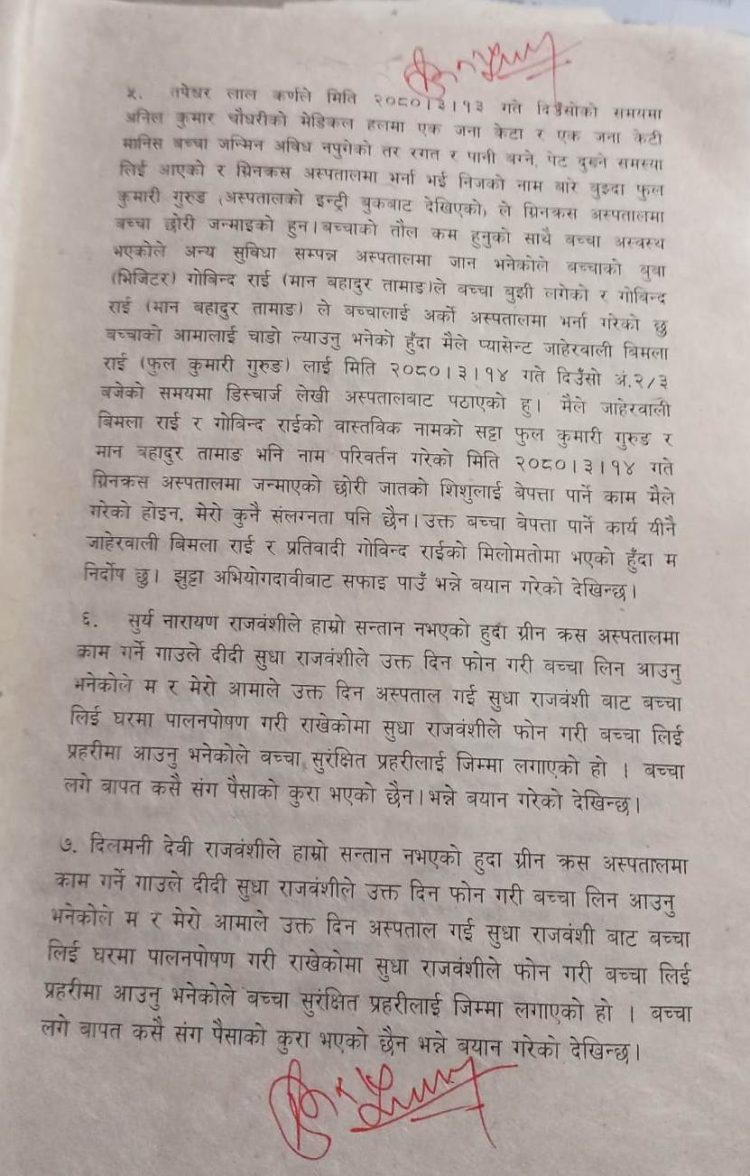 जन्मनासाथ अस्पतालबाटै गायव पारिएको शिशुलाई दिलमनीदेवीको घरमा फेला पारिएको हो । दिलमनीदेवीका छोरा सूर्यनारायणको बिहे भएको १० वर्षसम्म पनि सन्तान भएका थिएनन् । अविवाहित युवतीले बच्चा जन्माएको खबर पाउनसाथ अस्पताल आएका आमा दिलमनीदेवी र छोरा सूर्यनारायणले ५ लाखमा शिशु किनेर लगेको अनुसन्धानबाट यकिन भएको छ । शिशुकी आमालाई थाहै नदिइकन उनका प्रेमी अर्थात बच्चाका बाबु (गोविन्द) र चिकित्सक (डा. तपेश्वर)समेतको मिलेमतोमा बच्चा बिक्री गरिएको पत्ता लागेको हो । तपेश्वरले ग्रीनक्रस अस्पतालमा कार्यरत सरसफाइ कर्मचारी सुधा भनिने शुक्रीमार्फत दिलमनीदेवीको परिवारलाई बच्चा उपलब्ध गराएको खुलेको छ । शुक्री दिलमनीदेवीको आफन्त रहेको प्रहरीले जनाएको छ ।