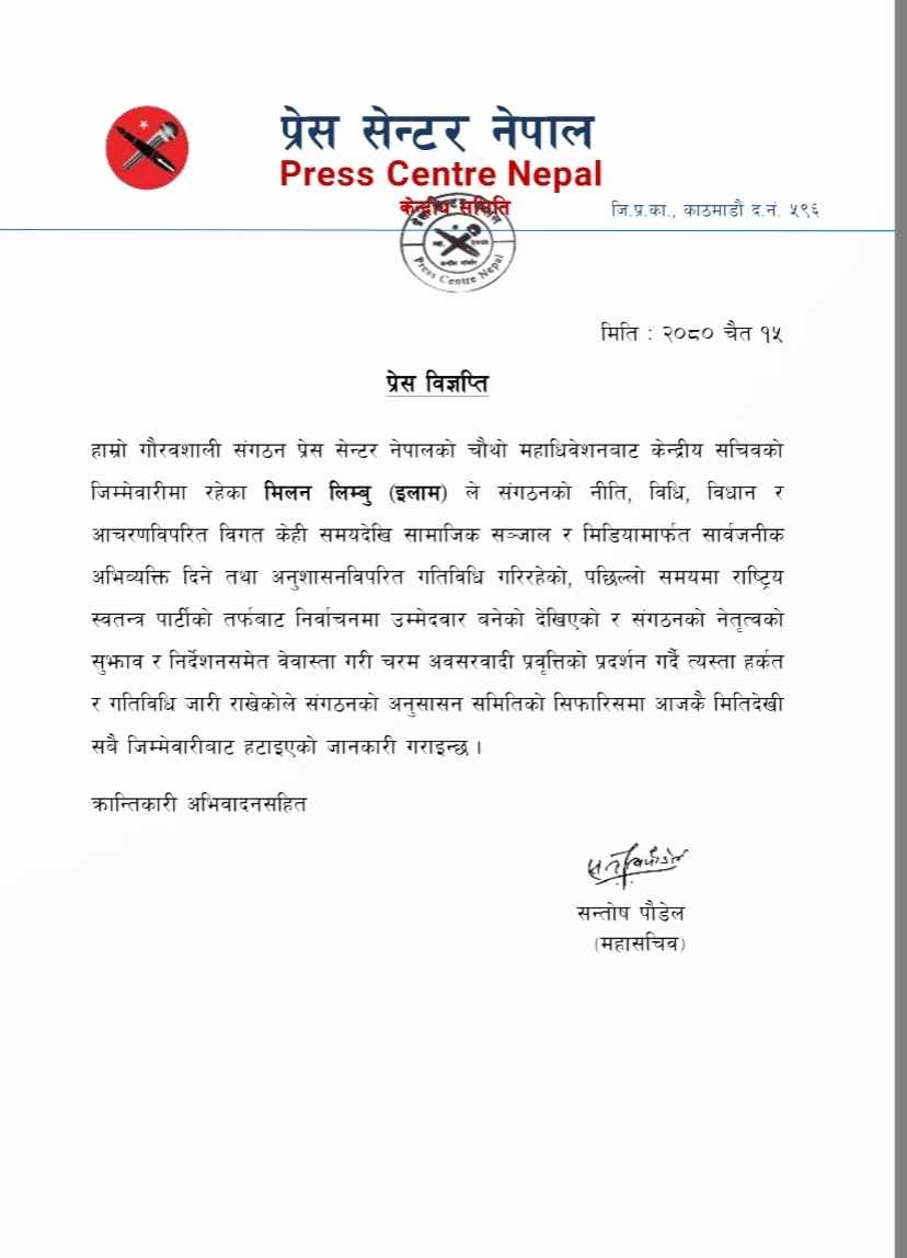 शुक्रबार प्रेस सेन्टरमा महासचिव सन्तोष पौडेलले एक प्रेस विज्ञप्ति जारी गर्दै सो सङ्गठनका सचिव रहेका लिम्बुले सङ्गठनको नेतृत्वको सुझाव र निर्देशनसमेत बेवास्ता गरी चरम अवसरवादी प्रवृत्तिको प्रदर्शन गरेको भन्दै सङ्गठनको सबै जिम्मेवारीबाट हटाइएको जनाएका छन् ।
