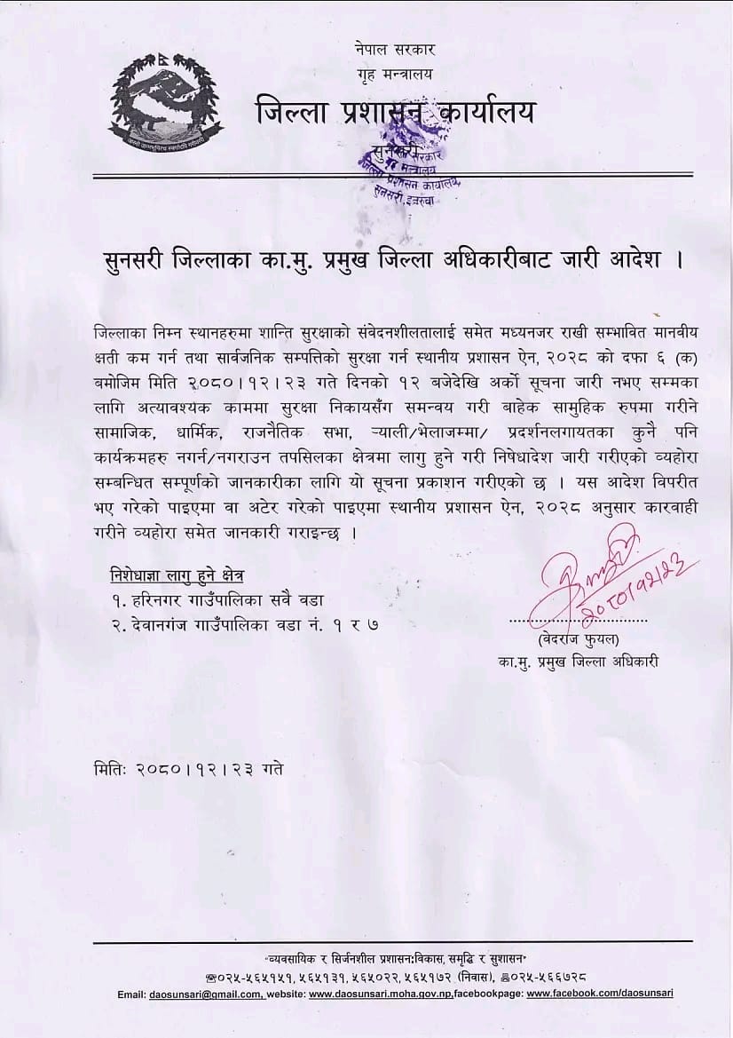 सुरक्षा संवेदन शीलतालाई ध्यानमा राख्दै सम्भावित मानवीय र सार्वजनिक सम्पत्तिको सुरक्षा गर्न स्थानीय प्रशासन ऐन २०२८ को दफा ६ क बमोजिम विभिन्न भेला प्रदर्शन गर्न नगराउन सुनसरी जिल्लाका कार्यवाहक प्रमुख जिल्ला अधिकारी वेदराज फुयाँलद्वारा हस्ताक्षर गरिएको सूचनामा उल्लेख गरिएको छ ।