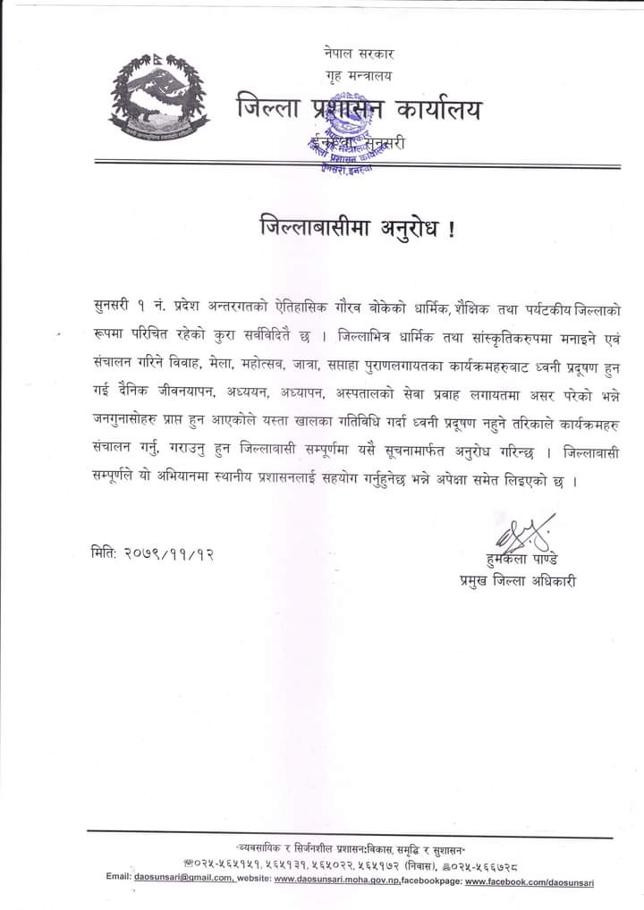 “जिल्ला भित्र धार्मिक तथा सांस्कृतिक रुपमा मनाइने एवं सञ्चालन गरिने विवाह, मेला, महोत्सव, जात्रा सप्ताह पुराण लगायतका कार्यक्रमहरुबाट ध्वनी प्रदूषण हुन गई दैनिक जीवनयापन, अध्ययन, अध्यापन, अस्पतालको सेवा प्रवाह लगायतमा असर परेको जनगुनासोहरु प्राप्त हुन आएकाले यस्ता खालका गतिबिधि गर्दा ध्वनी प्रदूषण नहुने गरी सञ्चालन गर्न हुन अनुरोध गरिन्छ ।”