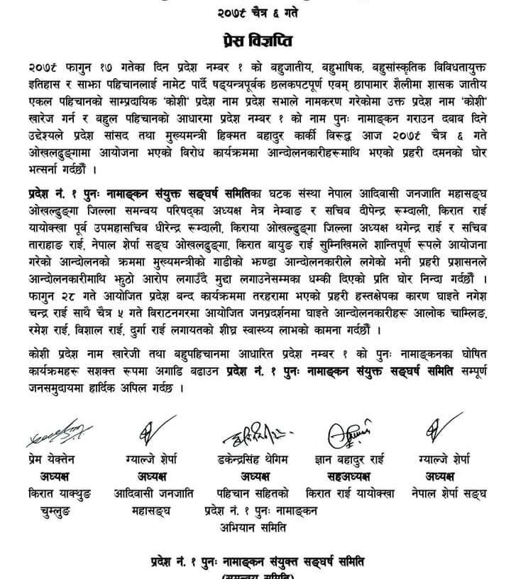 विज्ञप्तिमा किरात याक्थुम चुम्लुङका अध्यक्ष प्रेम येक्तेन, आदिवासी जनजाति महासंघका अध्यक्ष ग्याल्जे शेर्पा, पहिचानसहितको प्रदेश नम्बर १ पुनः नामांकन अभियान समितिका अध्यक्ष डकेन्द्रसिंह थेगिम, किरात राई यायोक्खाका अध्यक्ष ज्ञानबहादुर राई र नेपाल शेर्पा संघका अध्यक्ष ग्याल्जे शेर्पाको हस्ताक्षर छ । विज्ञप्तिमार्फत सार्वजनिक गरेको घाइतेको सूचीमा लिम्बूको नाम छ्रैन ।