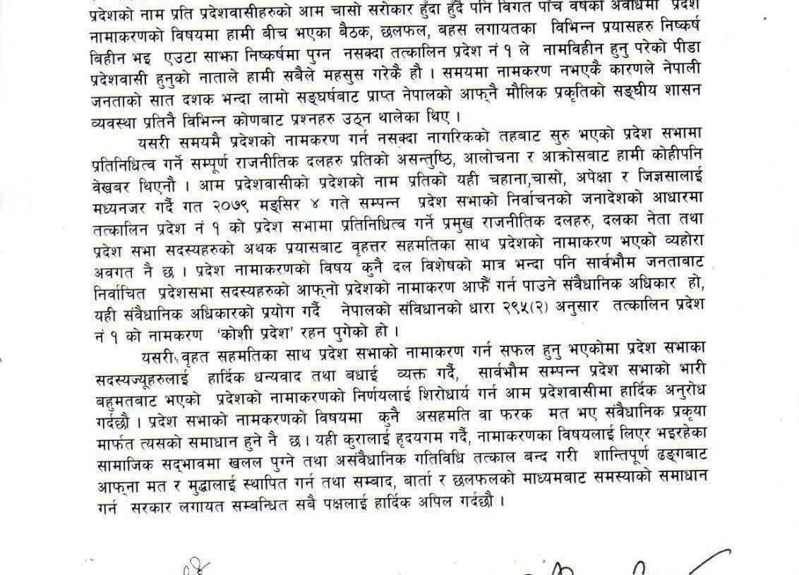 भारी बहुमतबाट भएको प्रदेशको नामकरणको विषयलाई शिरोधार्य गर्न पनि प्रदेशवासीमा विज्ञप्तिमार्फत आग्रह गरिएको छ । ‘नामका विषयमा कुनै असहमति वा फरक मत भएमा संवैधानिक प्रक्रियामार्फत त्यसको समाधान हुने नै छ । नामकरणका विषयलाई लिएर भइरहेका सामाजिक सद्भाव खलल पुग्ने तथा असंवैधानिक गतिविधि तत्काल बन्द गरी शान्तिपूर्ण ढंगबाट आफ्ना मत र मुद्दालाई स्थापित गर्न तथा वार्ता र छलफलबाट समस्याको समाधान खोज्न सरकारलगायत सम्बन्धित सबै पक्षलाई हार्दिक अपिल गर्दछौँ,’ विज्ञप्तिमा भनिएको छ ।