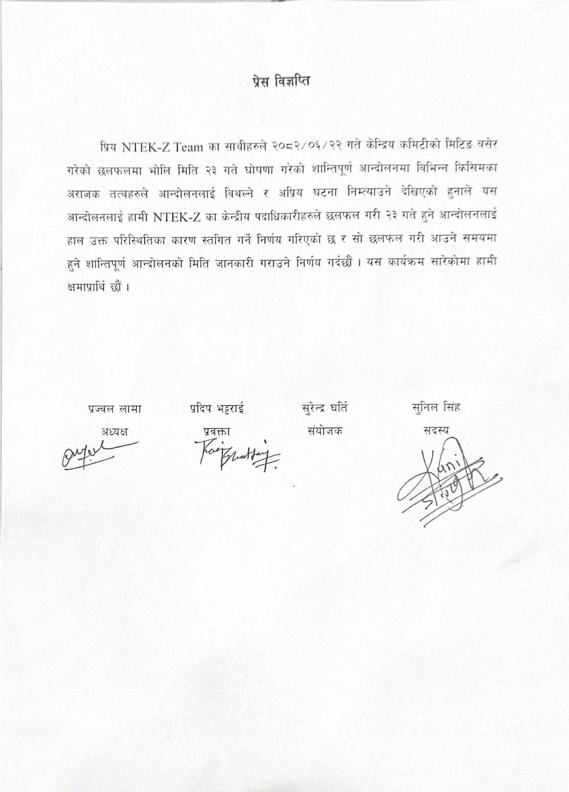 ‘साथीहरुले २०८२-०६-२२ गते केन्द्रिय कमिटीको मिटिङ बसेर गरेको छलफलमा भोलि मिति २३ गते घोषणा गरेको शान्तिपूर्ण आन्दोलनमा विभिन्न किसिमका अराजक तत्वहरुले आन्दोलनलाई विथल्ने र अप्रिय घटना निम्त्याउने देखिएको हुनाले यस आन्दोलनलाई हामी एनटीईके–जेड का केन्द्रीय पदाधिकारीहरुले छलफल गरी २३ गते हुने आन्दोलनलाई हाल उक्त परिस्थितिका कारण स्तगित गर्ने निर्णय गरिएको छ,’प्रेस विज्ञप्तिमा उल्लेख गरिएको छ ।