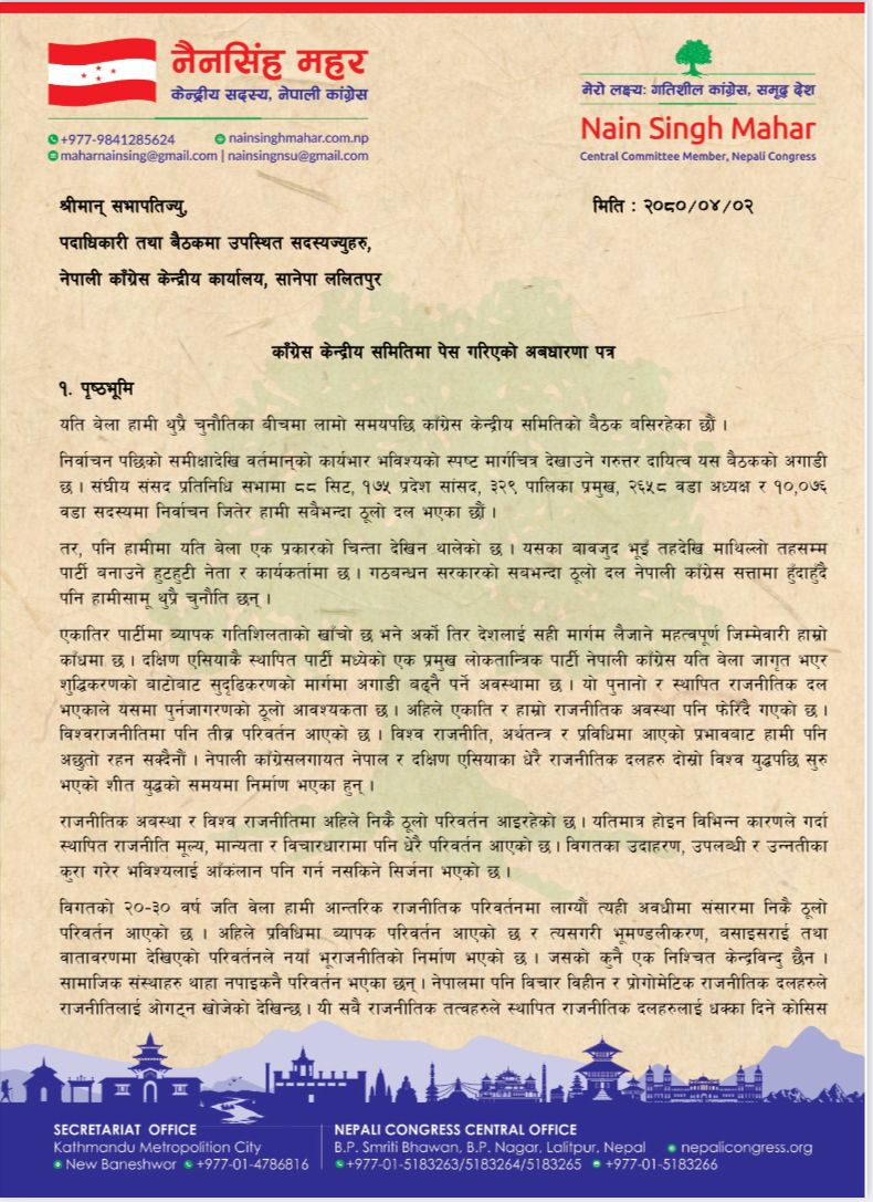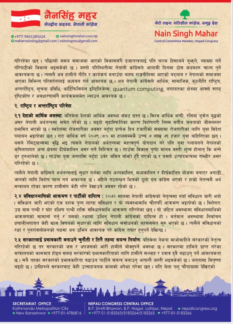 दक्षिण एसियाकै स्थापित पार्टीमध्येको एक प्रमुख लोकतान्त्रिक पार्टी नेपाली कांग्रेस यतिबेला जागृत भएर शुद्धीकरणको बाटोबाट सुदृढीकरणको मार्गमा बढ्नुपर्ने आवश्यकता देखिएको जनाएका छन्।
