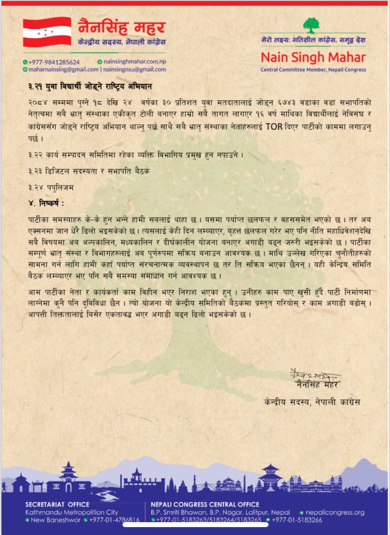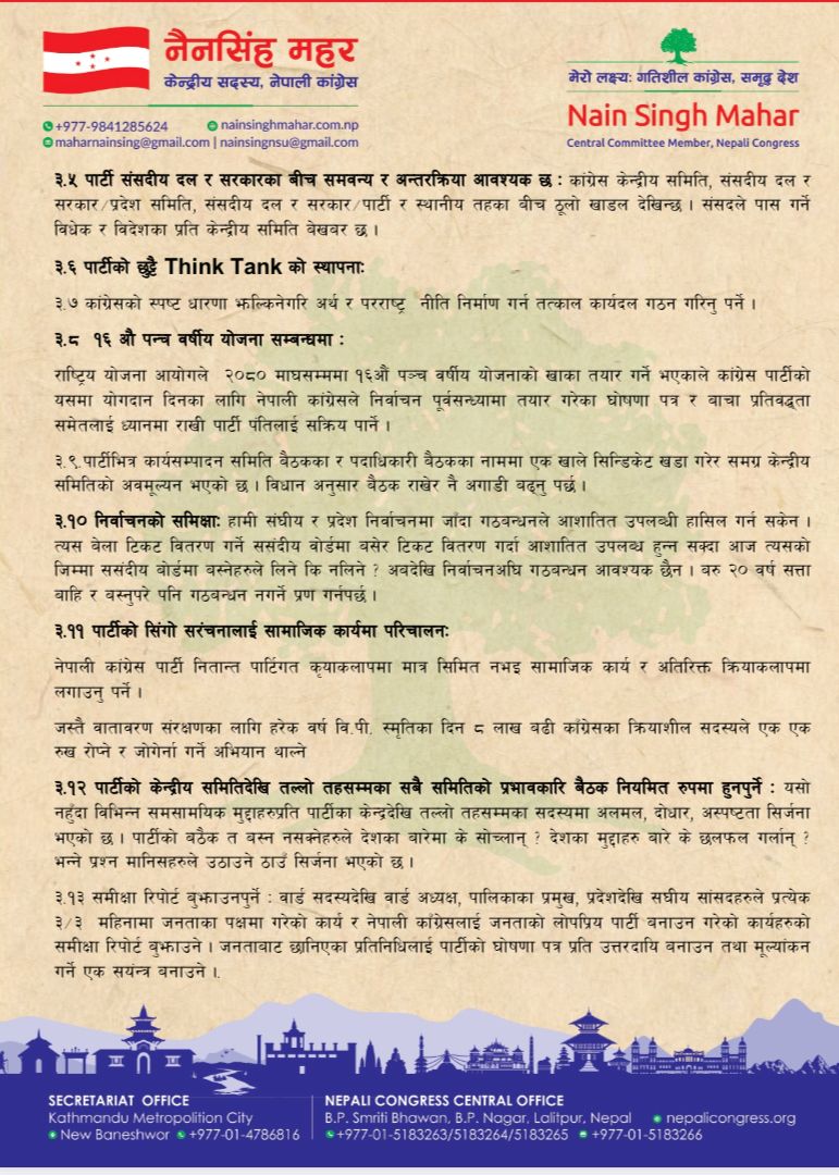 पार्टीमा पुनर्जागरण जरुरी रहेको भन्दै उनले विभिन्न सुझावहरु दिएका छन् ।