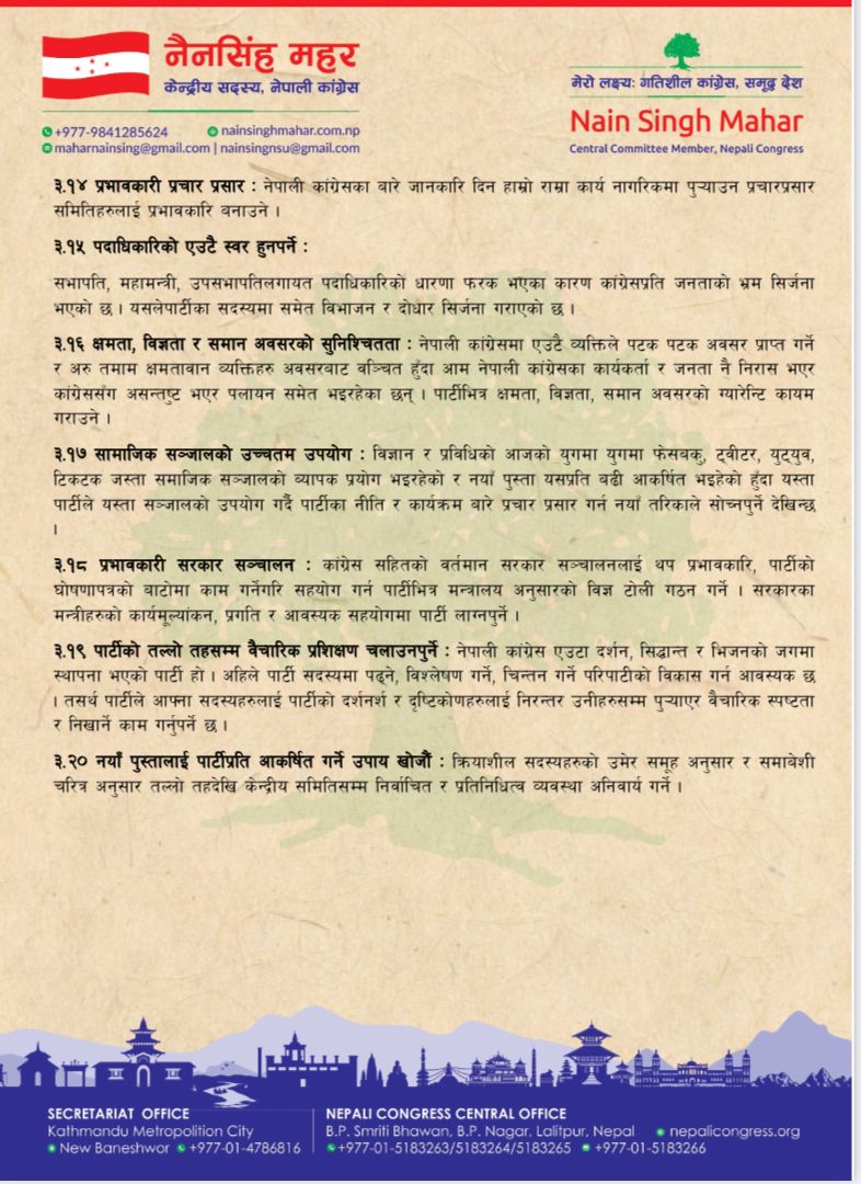 कांग्रेसले तत्कालै सुधार गर्नुपर्ने क्षेत्रहरु भन्दै महरले राजनीतिक दल र नेतालाई जनतासँग जोड्ने कार्य पहिलो प्राथमिकतामा हुनुपर्नेमा जोड दिएका छन्।