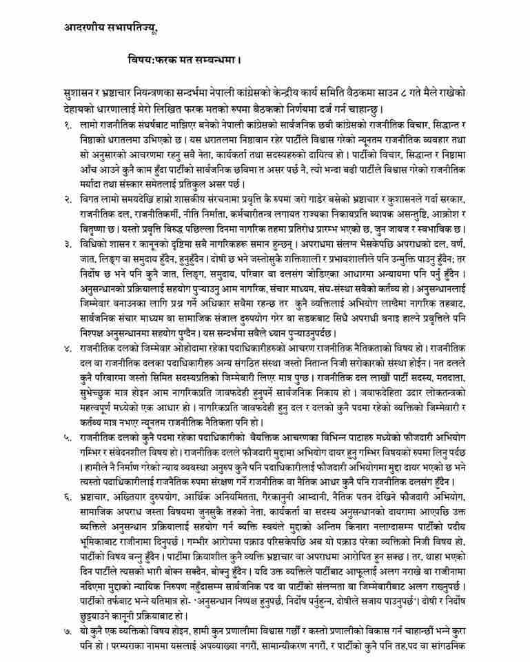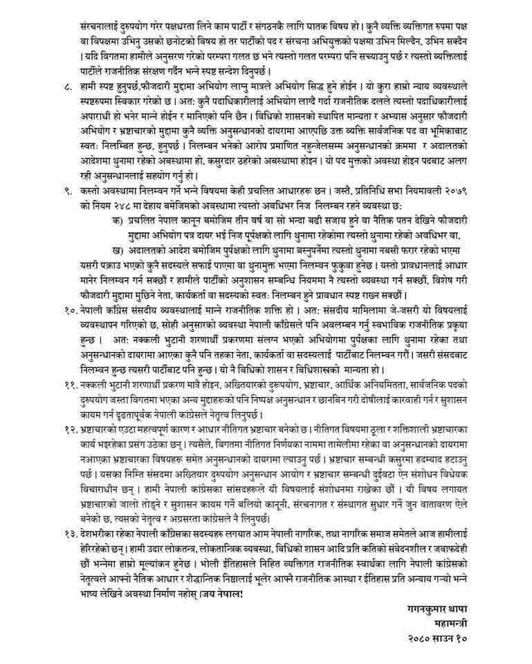 काठमाडौं । नेपाली कांग्रेसका महामन्त्री गगन थापाले १३ बुँदे फरक मत प्रस्तुत गरेका छन् ।