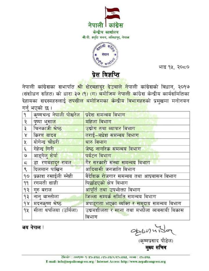सभापति देउवाले नेपाली कांग्रेसको विधान, २०१७ (संशोधन सहित) को धारा ३७ (१) (ग) बमोजिम उनीहरुलाई विभिन्न विभागको प्रमुखमा मनोनयन गरेका हुन् ।