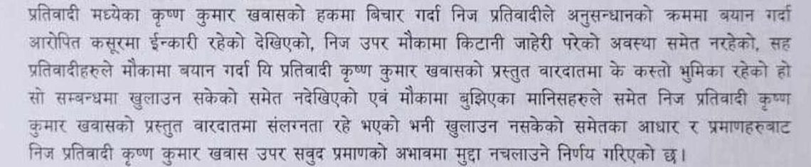 ‘प्रतिवादीमध्येका कृष्णकुमार खवासको हकमा विचार गर्दा निज प्रतिवादीले अनुसन्धानको क्रममा बयान गर्दा आरोपित कसूरमा इन्कारी रहेको देखिएको, निज उपर मौकामा किटानी जाहेरी परेको अवस्था समेत नरहेको, सहप्रतिवादीहरुले मौकामा बयान गर्दा यी प्रतिवादी खवासको प्रस्तुत वारदातमा के कस्तो भूमिका रहेको हो सो सम्बन्धमा खुलाउन सकेको समेत नदेखिएको एवं मौकामा बुझिएका मानिसहरुले समेत निज प्रतिवादी खवासको प्रस्तुत वारदातमा संलग्नता रहे भएको भनी खुलाउन नसकेको समेतका आधार र प्रमाणहरुबाट उनीउपर सवुद प्रमाणको अभावमा मुद्दा नचलाउने निर्णय गरिएको छ,’ सरकारी वकिलको अभियोगपत्रमा उल्लेख छ ।