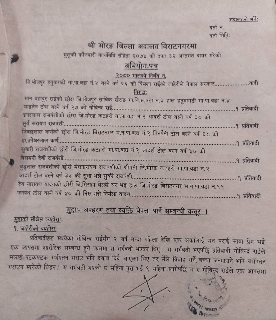 मुद्दामा विराटनगर–२ तीनपैनी घर भएका वरिष्ठ प्रसूति तथा स्त्रीरोग विशेषज्ञ ६८ वर्षीय डा. तपेश्वरलाल कर्ण, सिरहा घर भई विराटनगर–११ जनपथ टोल बस्ने ४० वर्षीया नीरु भनिने निर्मला यादव, भोजपुरको हतुवागढी गाउँपालिका–४ का २७ वर्षीय गोविन्द राई, मोरङको कटहरी गाउँपालिका–२ आदर्श टोलकी ३३ वर्षीया सुधा भनिने शुक्री राजवंशी, ३० वर्षीय सूर्यनारायण राजवंशी र ४७ वर्षीया दिलमनीदेवी राजवंशीलाई प्रतिवादी बनाइएको छ । अभियुक्तमध्ये गोविन्द र डा. तपेश्वर भदौ १ गते र अरु भदौ ५ गते पक्राउ परेका थिए ।