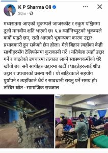 अध्यक्ष ओलीले जाजरकोट र रुकुमका नेताहरुसँग पनि भूकम्पको क्षतीका बारेमा टेलिफोनमा जानकारी लिएको उल्लेख गर्नुभएको छ ।