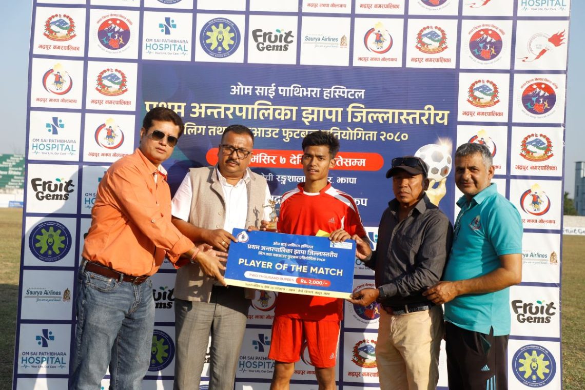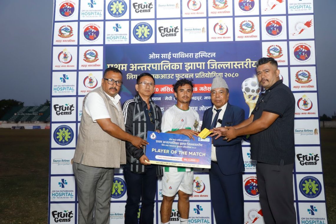 खेलको प्लेयर अफ दि म्याच गौरादहका नविन श्रेष्ठ भए । उनलाई गोल्डकपका अध्यक्ष दिपेश ढकाल, समाजसेवी रोहित बुढाथोकी, समाजसेवी पवन श्रेष्ठले नगद दुई हजार र ट्रफी प्रदान गरे ।