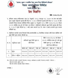निगमले बिहीबार एक विज्ञप्ति जारी गरी पेट्रोल, डिजेल र मट्टीतेलको लिटरमा दुई–दुई रूपैयाँ बढेको जानकारी दिएको छ । निमगका अनुसार खाना पकाउने ग्यास र हवाइ इन्धनको मूल्य भने यथावत राखिएको छ ।