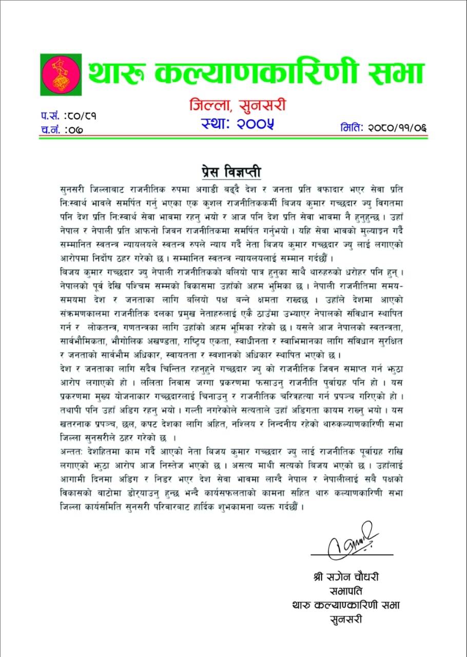 इटहरी / थारु कल्याणकारी समाज थाकस सुनसरीले ललिता निवास जग्गा प्रकरणमा नेपाली काँग्रेसका नेता एवं पूर्व उपप्रधानमन्त्री विजय कुमार गच्छदारलाई फसाउन गरिएको षड्यन्त्र असफल भएको बताएको छ ।