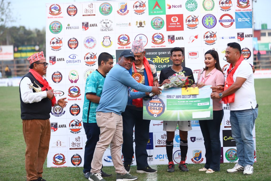 जितसँगै झापाले फाइनल प्रवेशका लागि शनिबार चर्चब्वाइजसँग खेल्नेछ । खेलको म्यान अफ द म्याच समिराज थोकर हुँदै नगद ११ हजार प्राप्त गरे । शुक्ररबारको पहिलो सेमिफाइनल खेल झापा गोल्डकपको चारपटक विजेता त्रिभुवन आर्मी र एपीएफ फुटबल क्लबबीच हुनेछ ।