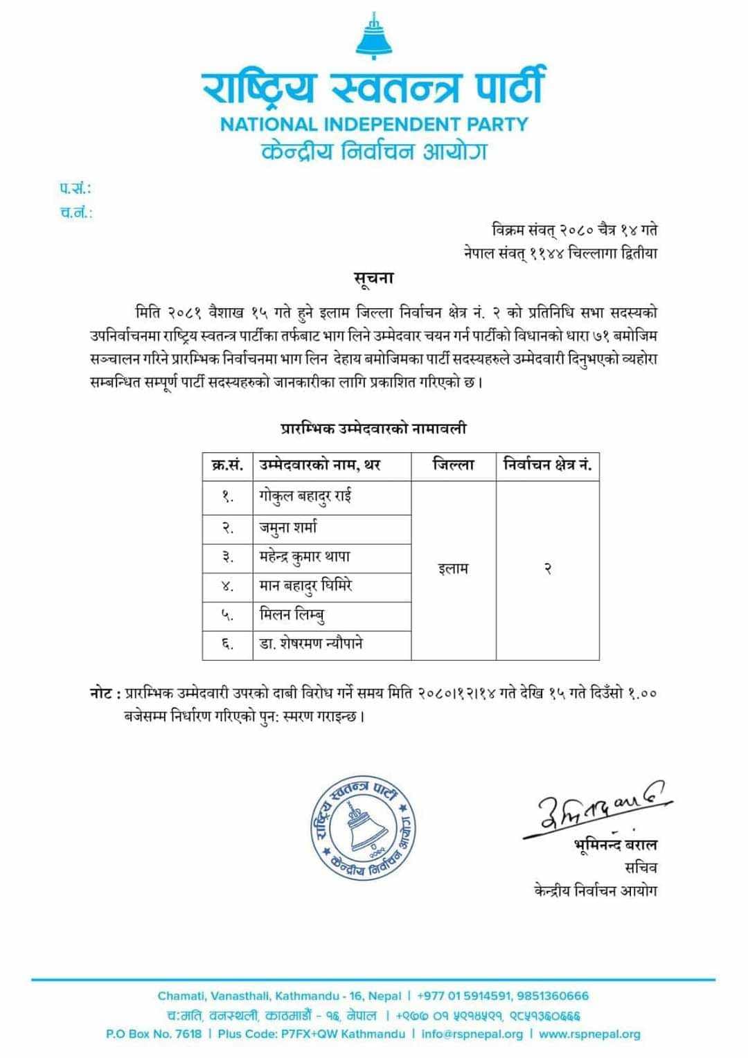 वैशाख १५ गते हुने उपनिर्वाचनका लागि गोकुलबहादुर राई, जमुना शर्मा, महेन्द्रकुमार थापा, मानबहादुर घिमिरे, मिलन लिम्बू र शेषरमण न्यौपानेको निवेदन परेको राष्ट्रिय स्वतन्त्र पार्टी (रास्वपा) का केन्द्रीय निर्वाचन आयोगका सचिव भूमिनन्द बरालले जनाएका छन्।