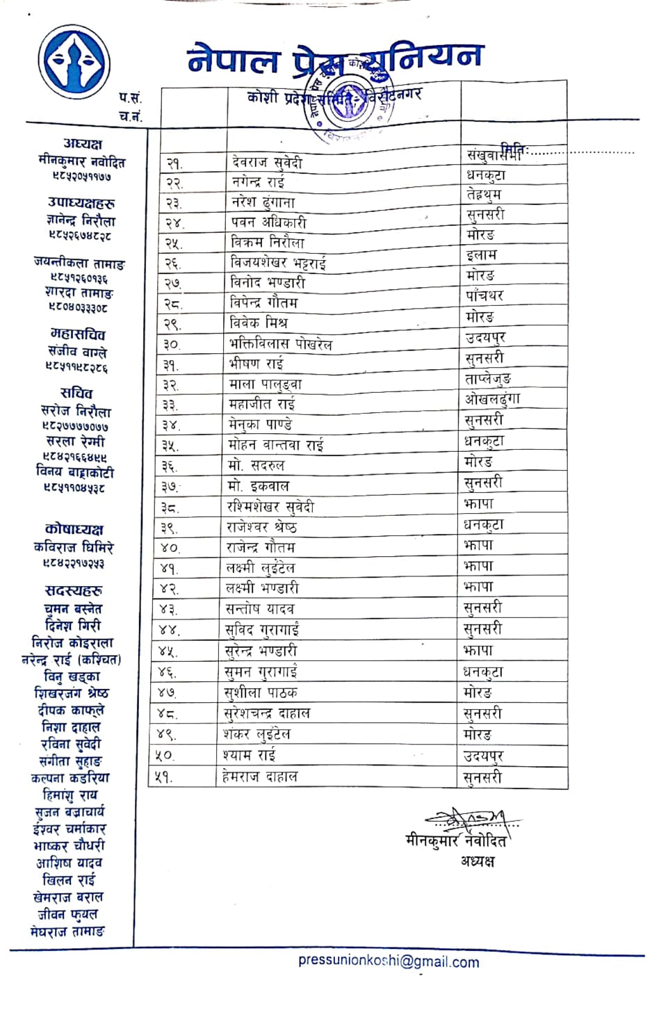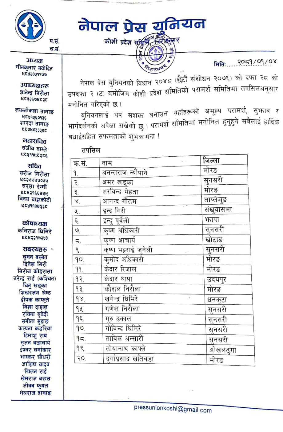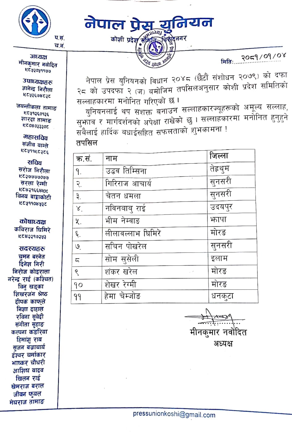 यसैगरी, युनियन कोशी प्रदेश समितिको परामर्श समितिमा ५१ जनालाई मनोनयन गरेको छ ।