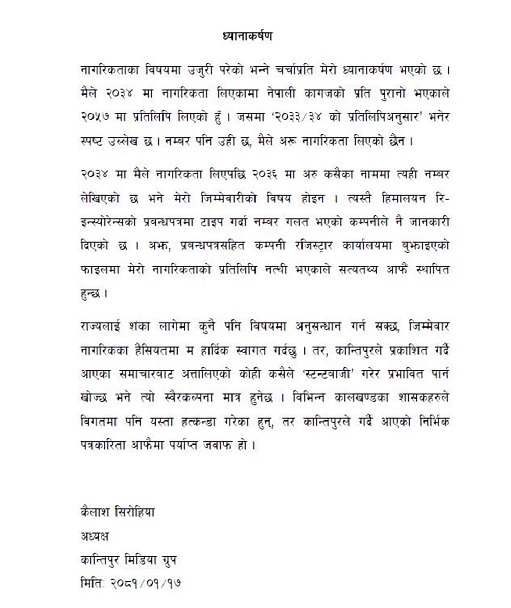 उनले अगाडी भनेका छन् ‘त्यस्तै हिमालयन रि– इन्स्योरेन्सको प्रबन्ध पत्रमा टाइप गर्दा नम्बर गलत भएको कम्पनीले नै जानकारी दिएको छ । अझ, प्रबन्ध पत्रसहित कम्पनी रजिस्ट्रार कार्यालयमा बुझाइएको फाइलमा मेरो नागरिकताको प्रतिलिपि नत्थी भएकाले सत्य तथ्य आफैँ स्थापित हुन्छ। राज्यलाई शङ्का लागेमा कुनै पनि विषयमा अनुसन्धान गर्न सक्छ, जिम्मेवार नागरिकका हैसियतमा म हार्दिक स्वागत गर्दछु ।’