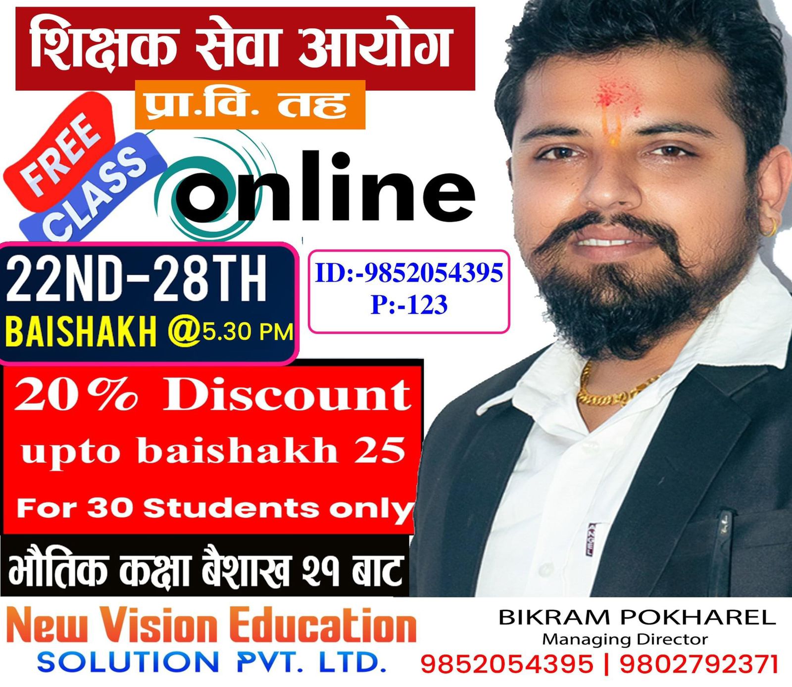 साथै शिक्षक सेवा आयोगको तयारी कक्षामा वैशाख २५ गतेसम्म भर्ना हुने पहिलो ३० जना विद्यार्थीलाई २० प्रतिशत छुटको व्यवस्था रहेको समेत उनले बताए ।