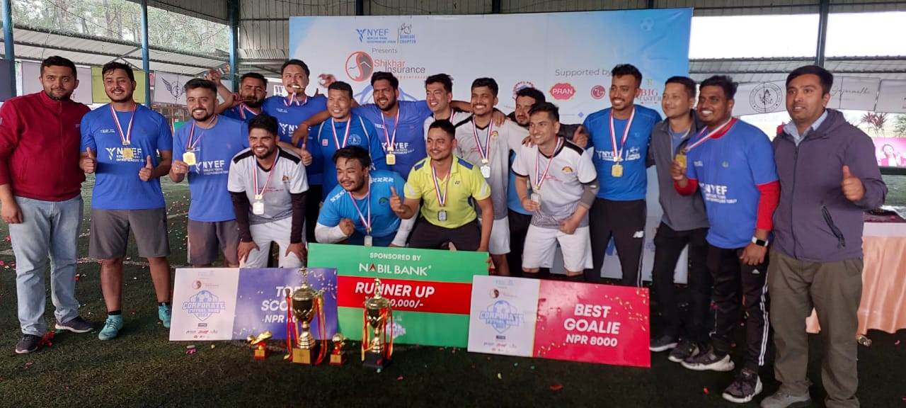 इटहरी । सुनसरीको इटहरीमा नेपाल युवा उद्यमी मञ्चको आयोजनामा स्वास्थ्यको लागि खेलकुद,खेलकुदको लागि स्वास्थ्य भन्ने मुल नाराका साथ शुरु भएको कर्पोरेट फुटसल प्रतियोगिताको उपाधि आयोजक नेपाल युवा उद्यमी मञ्चले जितेको छ । सनराइज बैंक उपविजेता बन्न सफल भएको छ ।