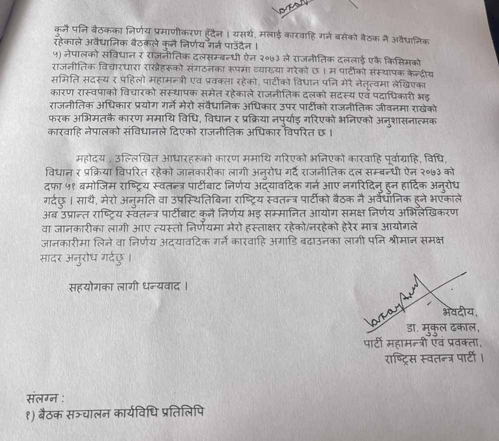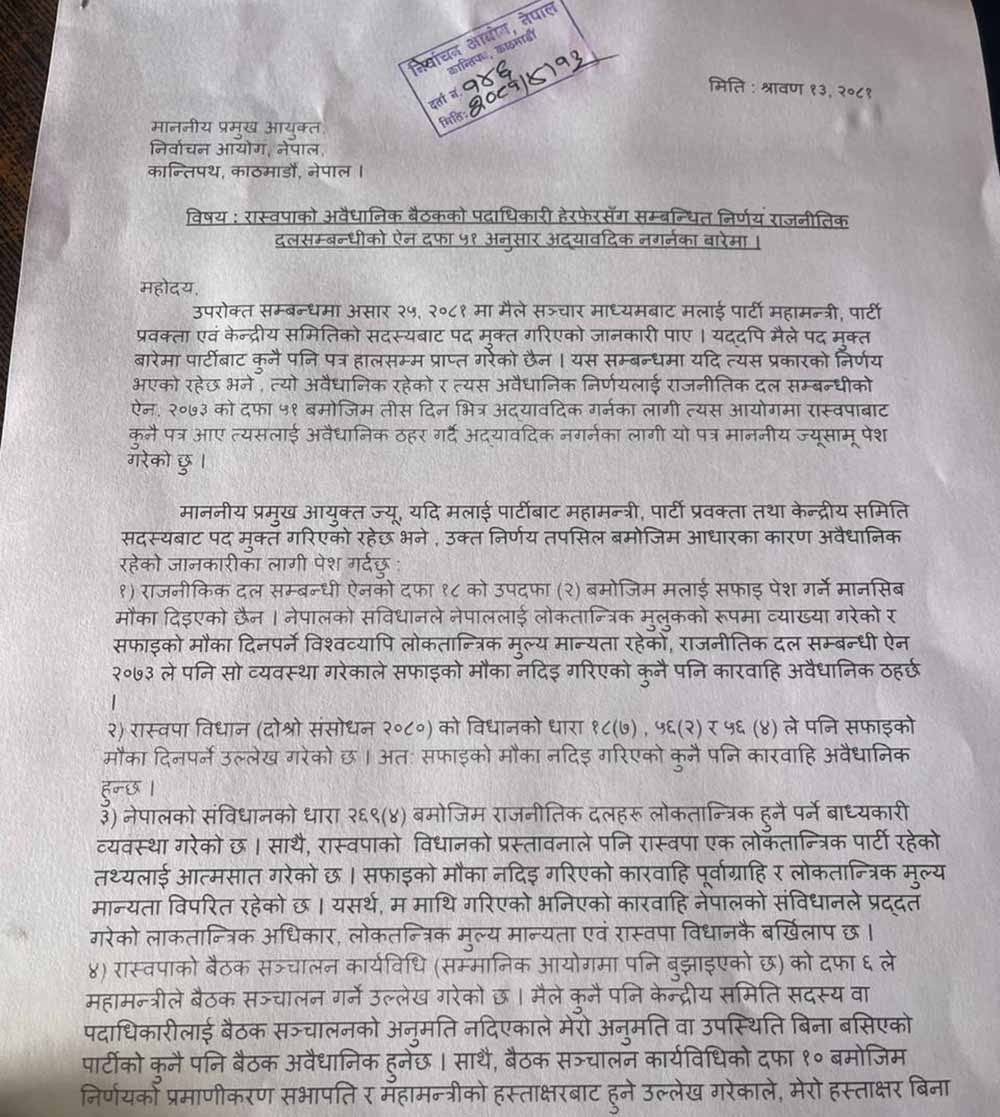 ढकालले आयोगमा निवेदन दिदै रास्वपाले आफुलाई पदबाट हटाएको पत्र अहिलेसम्म नपाएको र राजनीतिक दलसम्बन्धि ऐन अनुसार आयोगमा पार्टीको विवरण अद्यावधिक नगर्न आग्रह गरेका हुन् ।