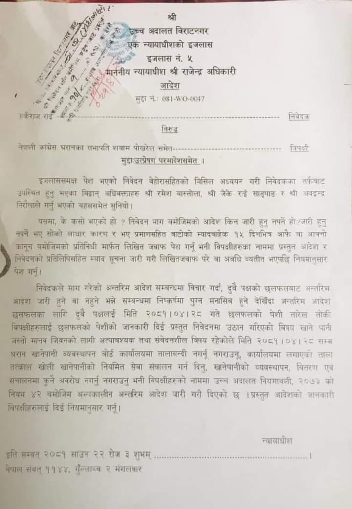 न्यायाधीश राजेन्द्र अधिकारीको इजलासले उत्प्रेषण परमादेश माग भएको निवेदनमा साउन २८ गतेसम्मको लागि खानेपानी बोर्डमा तालाबन्दी नगर्नू नगराउनू भनी अल्पकालीन अन्तरिम आदेश जारी गरेको हो।