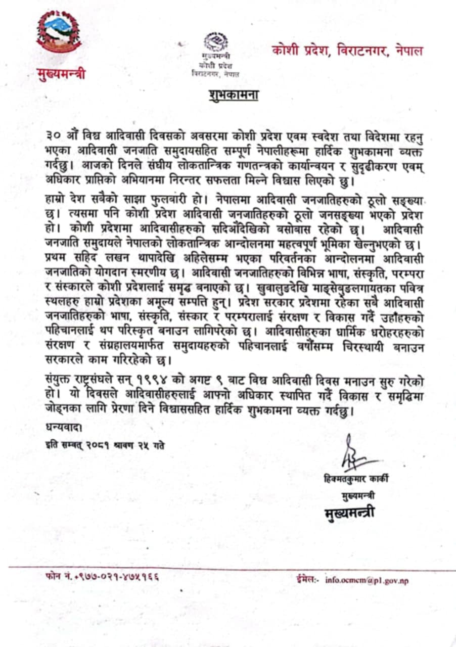 खुवालुङदेखि माङ्सेबुङलगायतका पवित्र स्थलहरू प्रदेशका अमूल्य सम्पत्ति रहेकाले यस्ता धार्मिक धरोहरहरूको संरक्षण र संग्रहालयमार्फत समुदायहरूको पहिचानलाई वर्षौंसम्म चिरस्थायी बनाउन प्रदेश सरकारले काम गरिरहेको सन्देशमा उल्लेख छ ।
