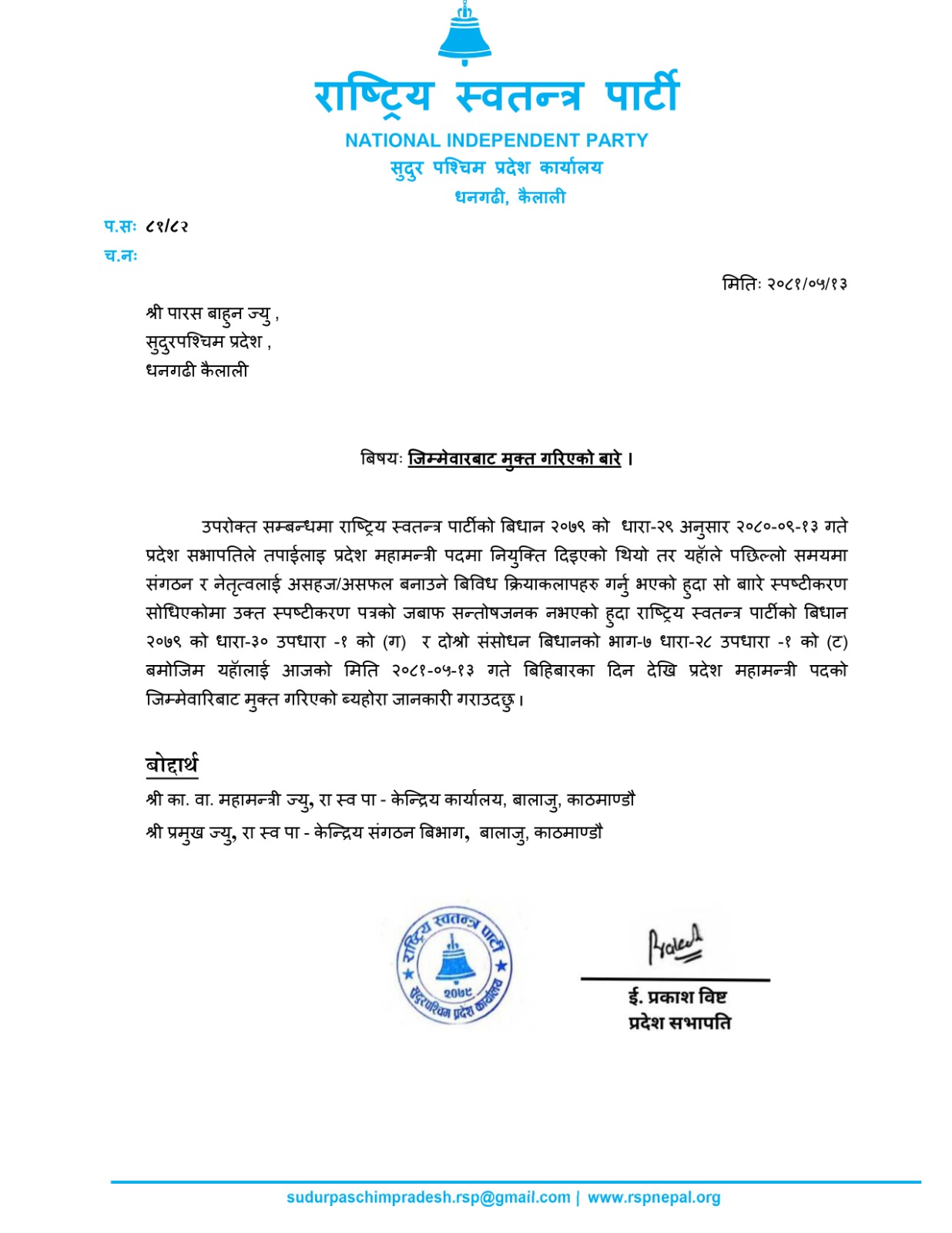 तर स्पष्टीकरणको जवाफ चित्तबुझ्दो नभएकाले बिहीबारदेखि लागू हुने गरी प्रदेश महामन्त्री पदको जिम्मेवारिबाट मुक्त गरिएको हो ।