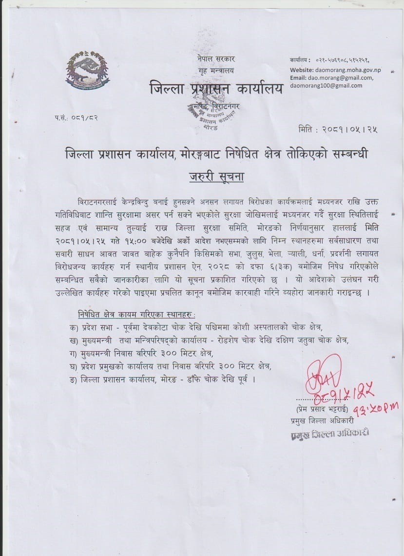 प्रजिअ भट्टराईका अनुसार प्रदेशसभा पूर्वमा देवकोटा चोकदेखि पश्चिममा कोशी अस्पतालको चोक, मुख्यमन्त्री तथा मन्त्रिपरिषद्को कार्यालय रोड शेष चोकदेखि दक्षिण जतुवा चोक, मुख्यमन्त्री निवास वरिपरि ३ सय मिटर, प्रदेश प्रमुखको कार्यालय तथा निवास वरिपरि ३ सय मिटर र जिल्ला प्रशासन कार्यालय मोरङ डाँफे चोकदेखि पूर्वको क्षेत्रलाई निषेधित क्षेत्र घोषित गरिएको छ ।