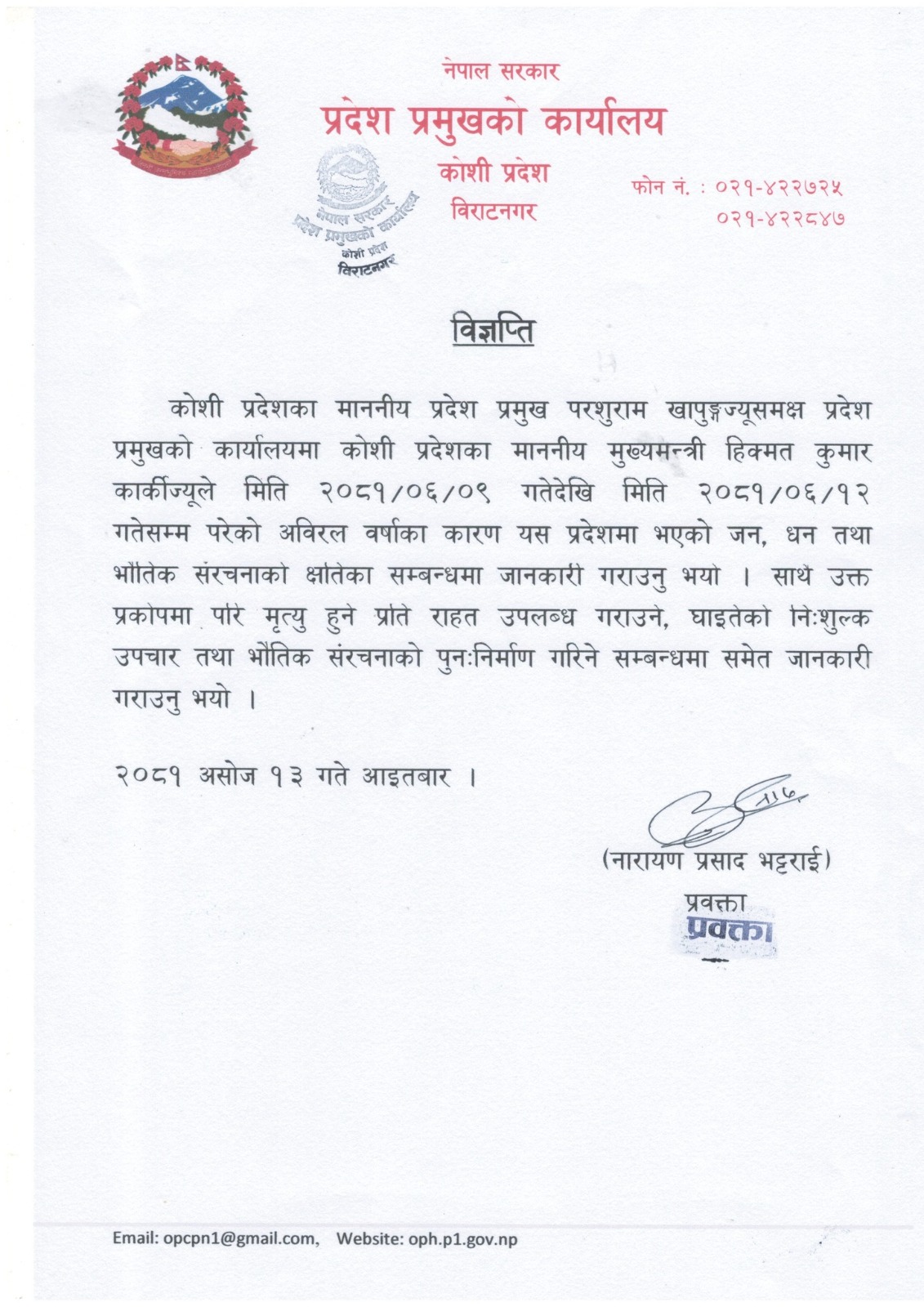 वर्षाका कारण भएको विपद सम्बन्धी घटनाहरू र विपद व्यवस्थापनका सम्बन्धमा कोशी प्रदेश सरकारले गरेका पहलकद्मीका सन्दर्भमा र कोशी प्रदेश सरकार मन्त्रीपरिषदबाट सम्पादन भएका काम कारबाहीका सम्बन्धमा आइतबार (आज) कोशी प्रदेशका मुख्यमन्त्री कार्कीले प्रदेश प्रमुख खापुङलाई जानकारी गराएका हुन् ।