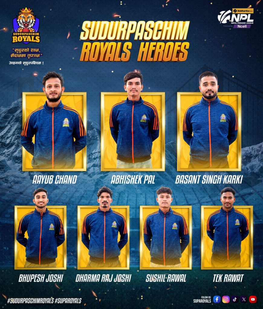 रोयल्सले पछिल्लो केही दिनदेखि धनगढीमा रहेर प्रशिक्षण गरिरहेको छ । टोली अब एनपिएल खेल्न काठमाडौं प्रस्थान गर्नेछ । सुदूरपश्चिम रोयल्सको मार्की खेलाडी सुदूरपश्चिम प्रदेशकै दिपेन्द्र सिंह ऐरी छन् । मेन्टरमा अष्ट्रेलियाका ब्राड हज र मुख्य प्रशिक्षकमा जगत टमाटा छन् ।