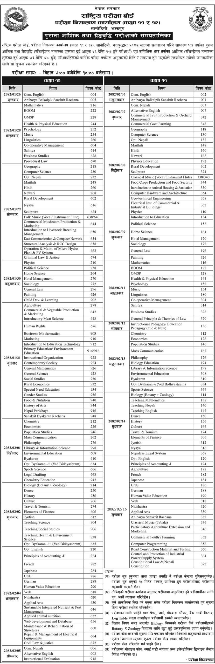 काठमाडौं । राष्ट्रिय परीक्षा बोर्ड परीक्षा नियन्त्रण कार्यालयले कक्षा ११ र १२ का परीक्षार्थीहरूको लागि पुराना आंशिक र ग्रेडवृद्धि परीक्षाको समय तालिका सार्वजनिक गरेको छ । आगामी २०८२ वैशाख २६ गतेदेखि हुने परीक्षामा साधारणतर्फ र प्राविधिकतर्फका परीक्षार्थीहरूको परीक्षा तालिका प्रकाशित गरिएको हो ।