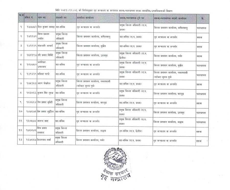 आज गृह मन्त्रालयले १३ जना कर्मचारीको सरूवा तथा पदस्थापन गरेको हो। जसमध्ये सातजना सीडिओ हेरफेर भएका हुन् ।