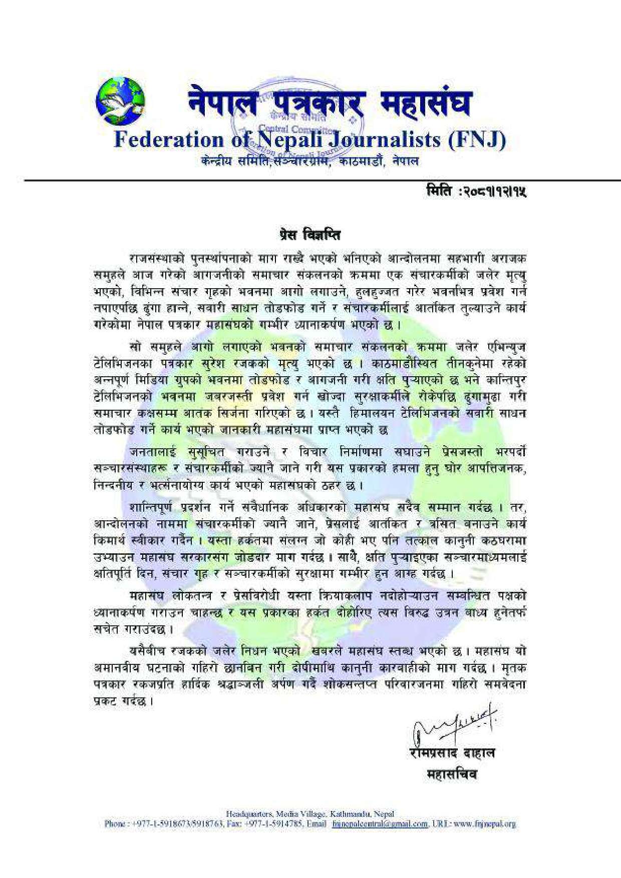 महासंघले विज्ञप्तिमार्फत पत्रकार सुरेश रजकको मृत्यु भएको, कान्तिपुर टेलिभजनमा ढुंगामुढा गरिएको, अन्तपूर्ण पोष्टको भवनमा तोडफोड गरेर आतंक सिर्जना भएको जनाएको हो । त्यसक्रममा हिमालयन टेलिभिजनको सवारीसाधनमा पनि तोडफोड भएको छ ।