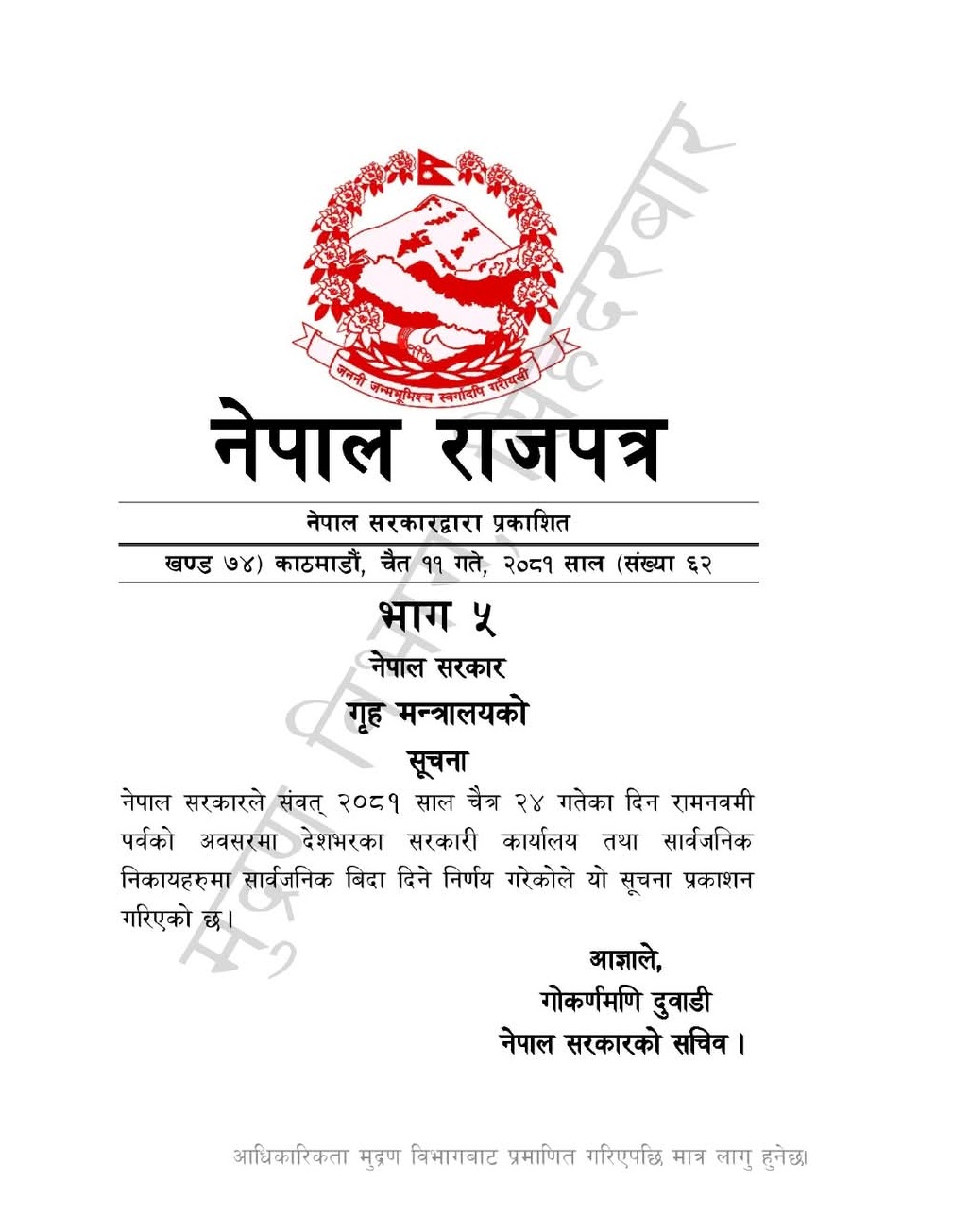 सरकारले आगामी आईतबार देशभर सार्वजनिक विदाको निर्णय गरेको छ । चैत ४ गते बसेको मन्त्रिपरिषद् बैठकले चैत २४ गते रामनवमीका अवसरमा सार्वजनिक बिदा दिने निर्णय गरेको हो । बिदा सम्बन्धी सूचना राजपत्रमा प्रकाशित गरिएको छ।